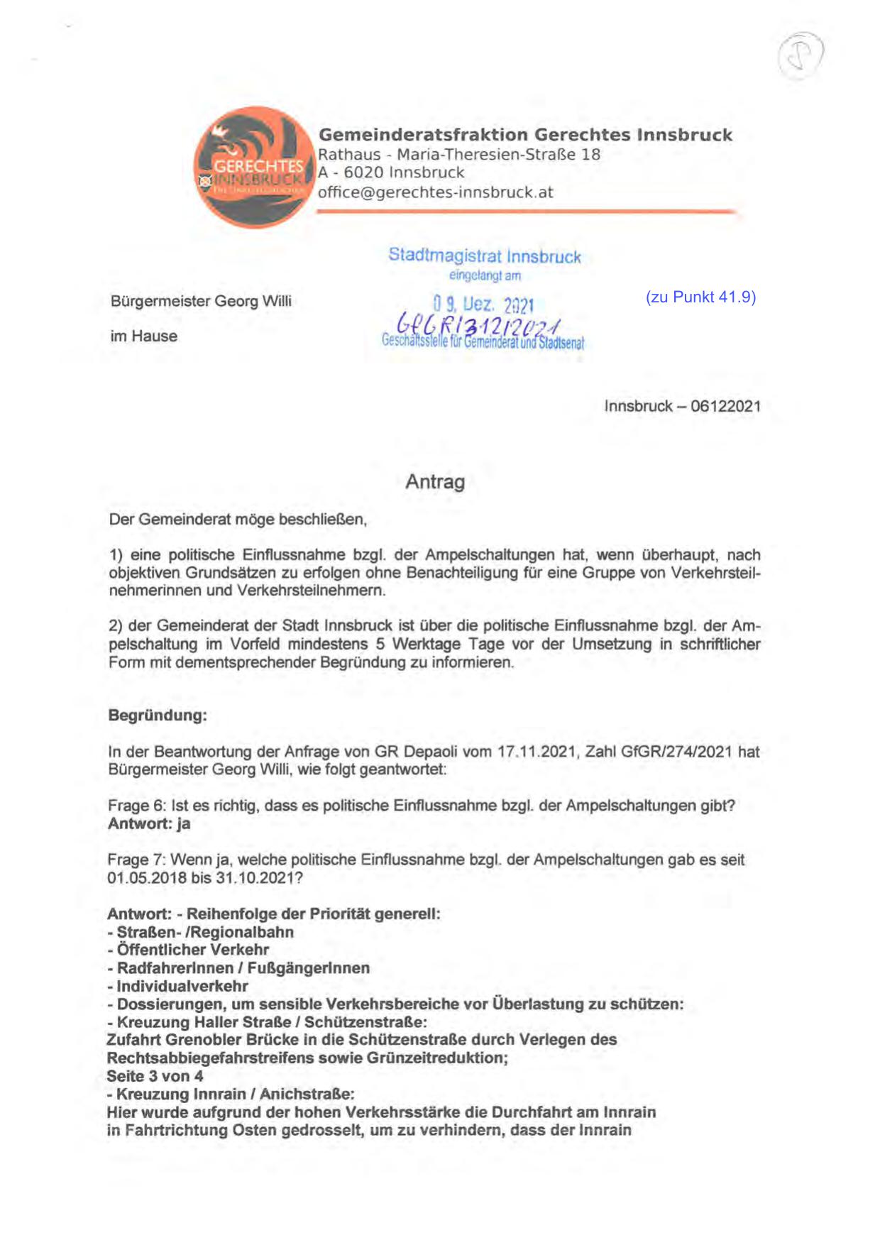 2) der Gemeinderat der Stadt Innsbruck ist über die politische Einflussnahme bzgl. der Ampelschaltung im Vorfeld mindestens 5 Werktage Tage vor der Umsetzung in schriftlicher