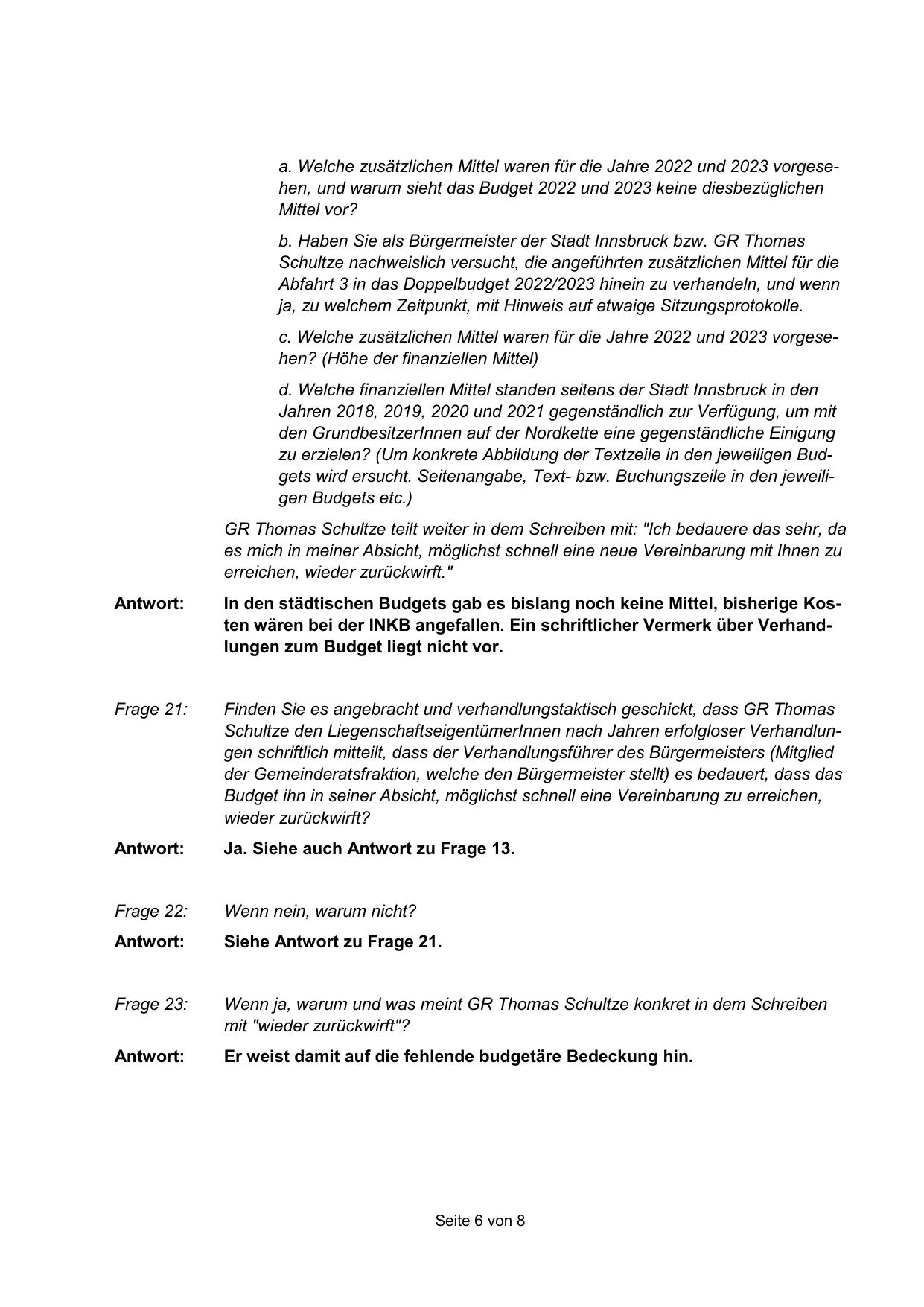 In den städtischen Budgets gab es bislang noch keine Mittel, bisherige Kosten wären bei der INKB angefallen. Ein schriftlicher Vermerk über Verhandlungen zum Budget liegt nicht vor.