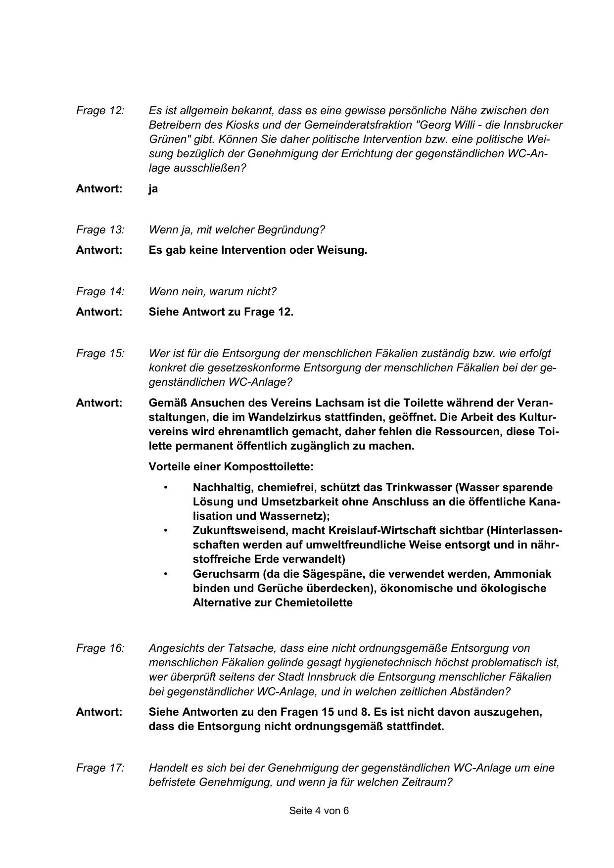 Grünen" gibt. Können Sie daher politische Intervention bzw. eine politische Weisung bezüglich der Genehmigung der Errichtung der gegenständlichen WC-Anlage ausschließen?