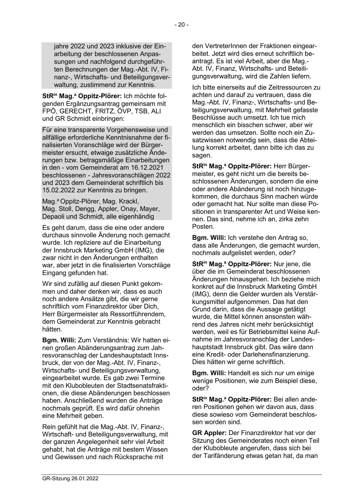 Bgm. Willi: Zum Verständnis: Wir hatten einen großen Abänderungsantrag zum Jahresvoranschlag der Landeshauptstadt Innsbruck, der von der Mag.-Abt. IV, Finanz-,