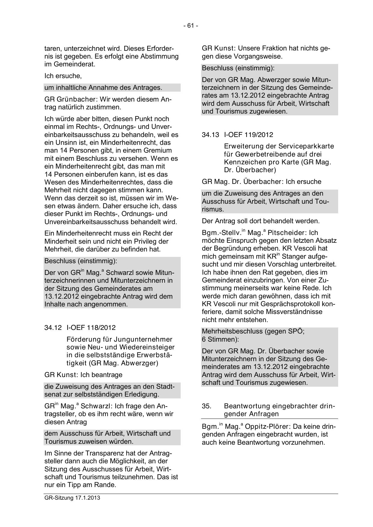 Der von GR Mag. Abwerzger sowie Mitunterzeichnern in der Sitzung des Gemeinderates am 13.12.2012 eingebrachte Antrag