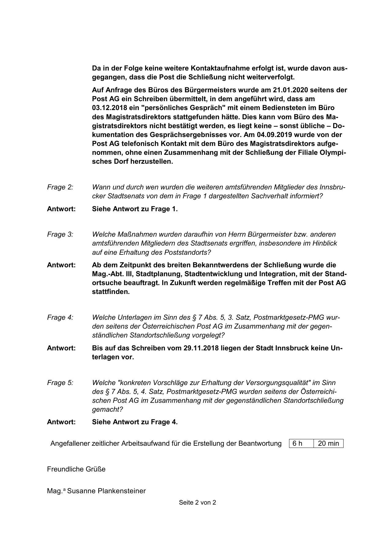 Post AG telefonisch Kontakt mit dem Büro des Magistratsdirektors aufgenommen, ohne einen Zusammenhang mit der Schließung der Filiale Olympisches Dorf herzustellen.