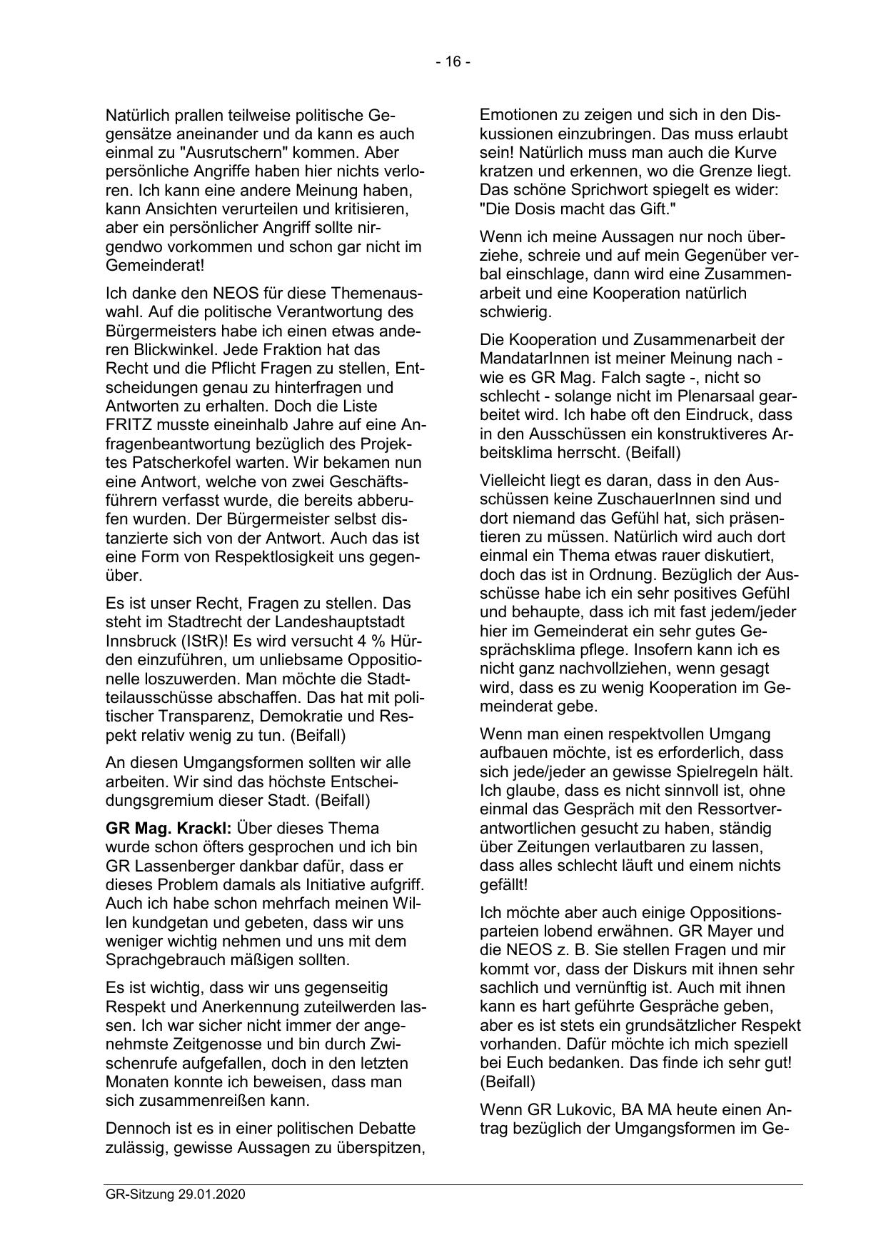 Innsbruck (IStR)! Es wird versucht 4 % Hürden einzuführen, um unliebsame Oppositionelle loszuwerden. Man möchte die Stadtteilausschüsse abschaffen. Das hat mit politischer Transparenz, Demokratie und Respekt relativ wenig zu tun. (Beifall)