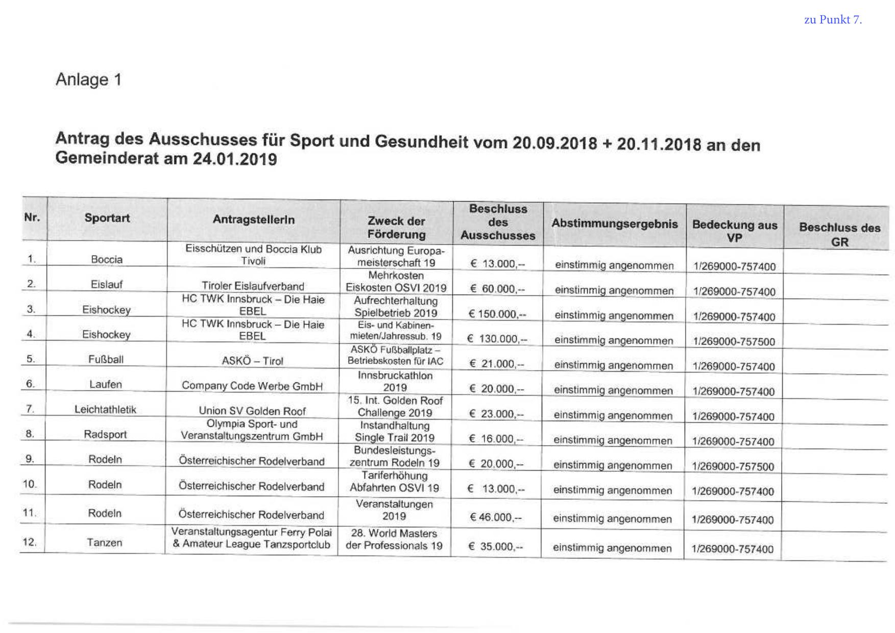 Antrag des Ausschusses für Sport und Gesundheit vom 20.09.2018 + 20.11.2018 an den