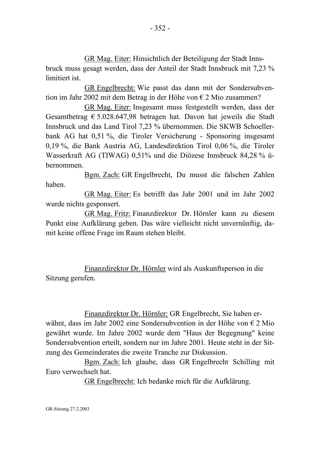 Finanzdirektor Dr. Hörnler: GR Engelbrecht, Sie haben erwähnt, dass im Jahr 2002 eine Sondersubvention in der Höhe von € 2 Mio