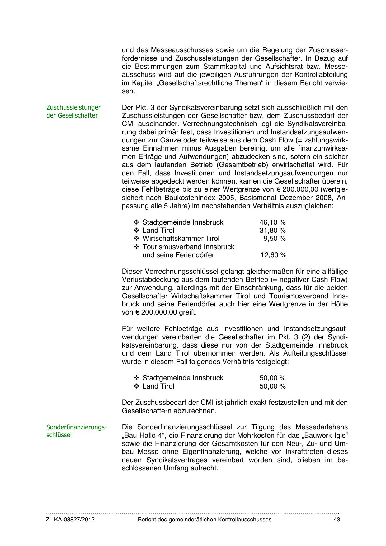 Für weitere Fehlbeträge aus Investitionen und Instandsetzungsaufwendungen vereinbarten die Gesellschafter im Pkt. 3 (2) der Syndikatsvereinbarung, dass diese nur von der Stadtgemeinde Innsbruck
