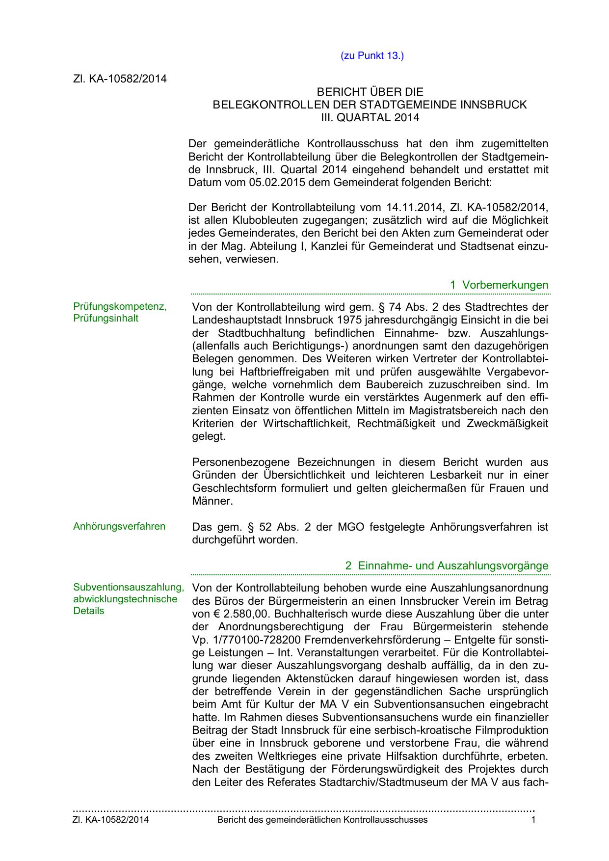Bericht der Kontrollabteilung über die Belegkontrollen der Stadtgemeinde Innsbruck, III. Quartal 2014 eingehend behandelt und erstattet mit