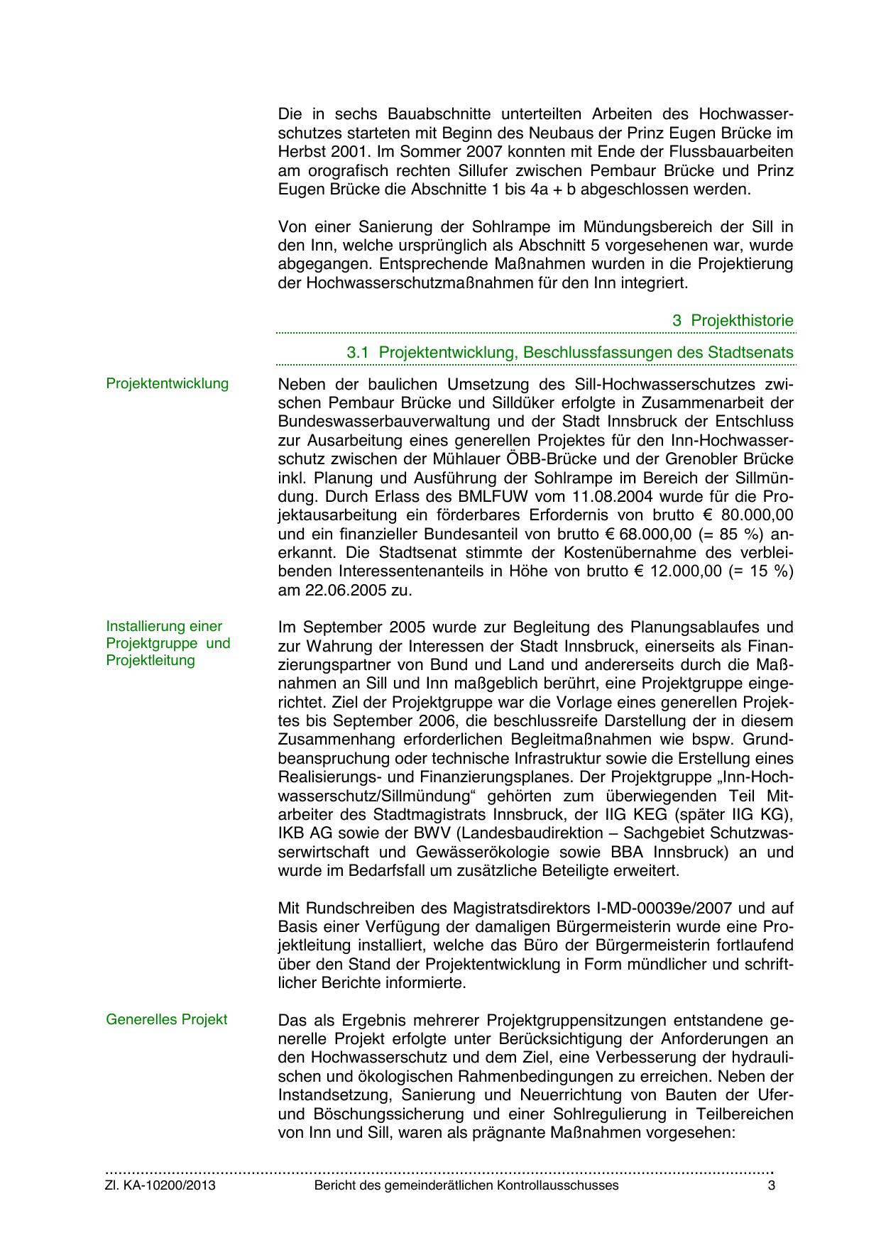 zur Wahrung der Interessen der Stadt Innsbruck, einerseits als Finanzierungspartner von Bund und Land und andererseits durch die Maßnahmen an Sill und Inn maßgeblich berührt, eine Projektgruppe eingerichtet. Ziel der Projektgruppe war die Vorlage eines generellen Projektes bis September 2006, die beschlussreife Darstellung der in diesem