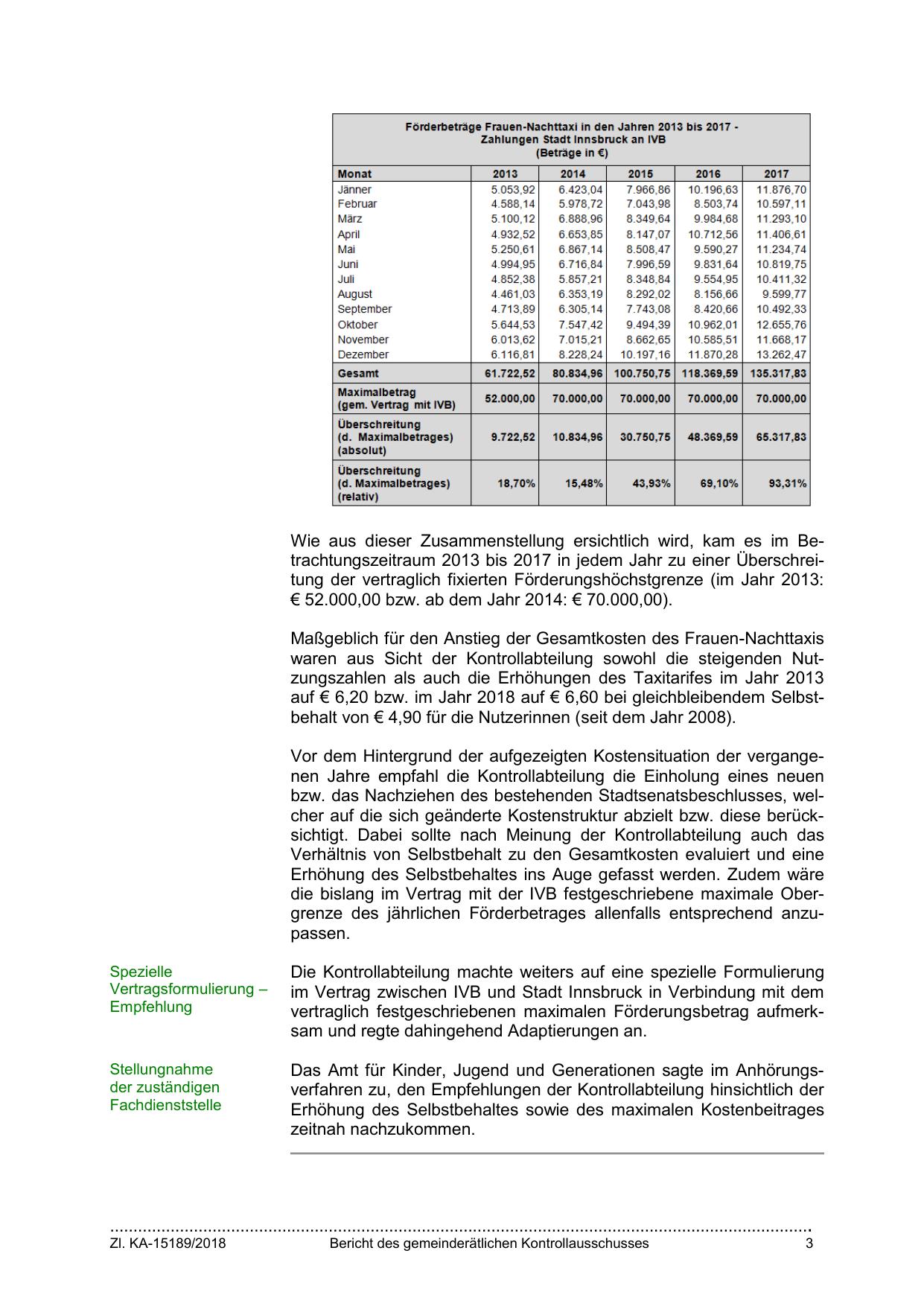 Förderbeträge Frauen-Nachttaxi in den Jahren 2013 bis 2017 Zahlungen Stadt Innsbruck an IVB