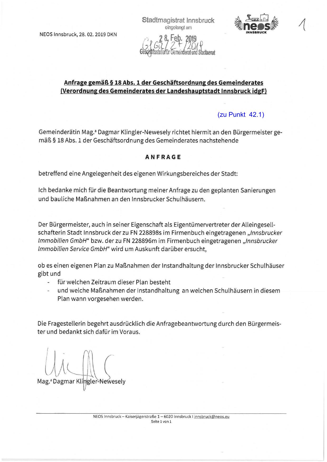 Gemeinderätin Mag.a Dagmar Klingler-Newesely richtet hiermit an den Bürgermeister gemäß§ 18 Abs. 1 der Geschäftsordnung des Gemeinderates nachstehende