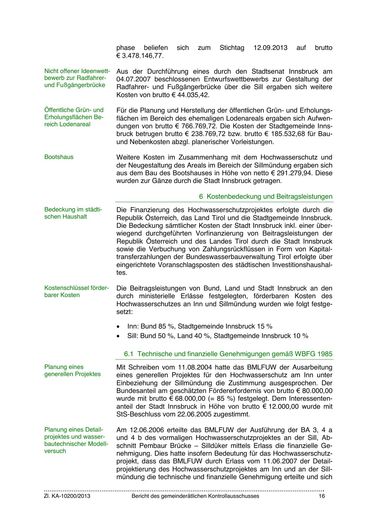 und 4 b des vormaligen Hochwasserschutzprojektes an der Sill, Abschnitt Pembaur Brücke – Silldüker mittels Erlass die finanzielle Genehmigung. Dies hatte insofern Bedeutung für das Hochwasserschutzprojekt, dass das BMLFUW durch Erlass vom 11.06.2007 der Detailprojektierung des Hochwasserschutzprojektes am Inn und an der Sillmündung die technische und finanzielle Genehmigung erteilte und sich