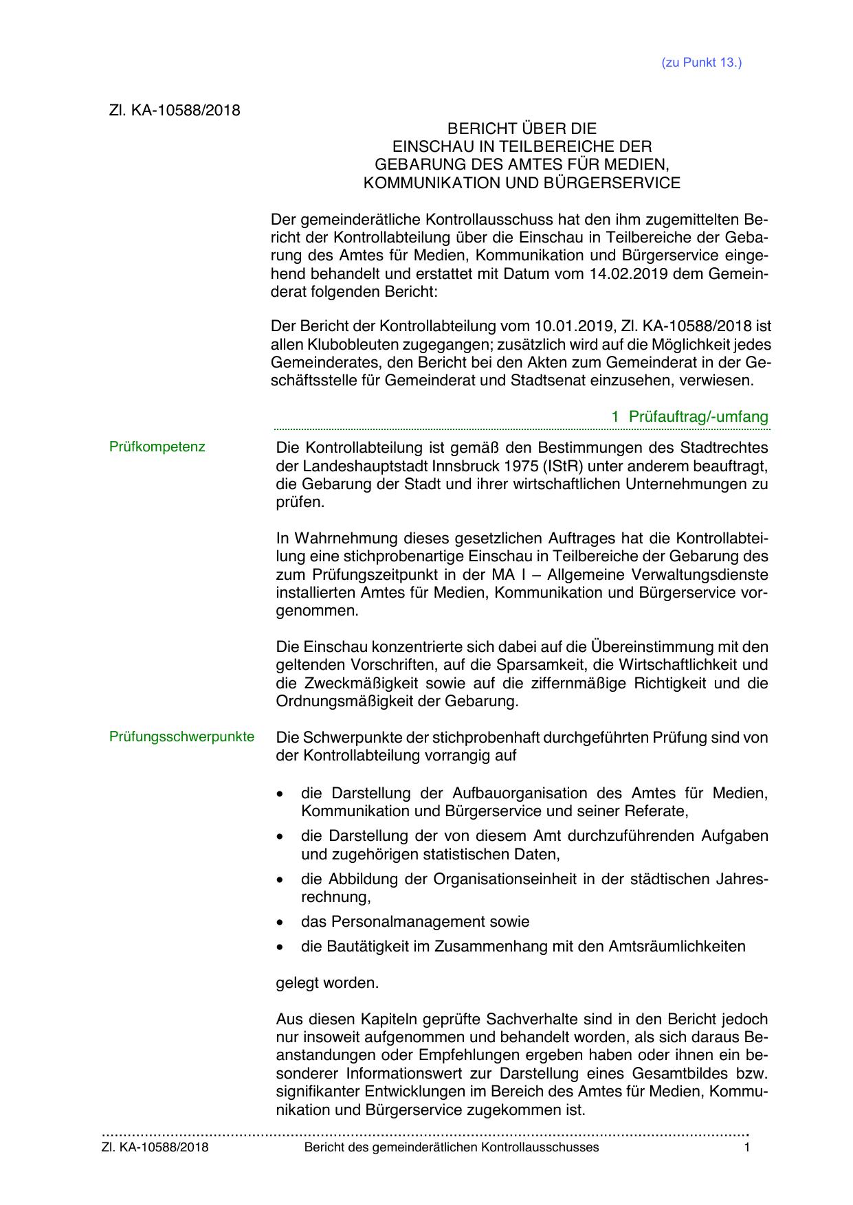 Der gemeinderätliche Kontrollausschuss hat den ihm zugemittelten Bericht der Kontrollabteilung über die Einschau in Teilbereiche der Gebarung des Amtes für Medien, Kommunikation und Bürgerservice eingehend behandelt und erstattet mit Datum vom 14.02.2019 dem Gemeinderat folgenden Bericht:
