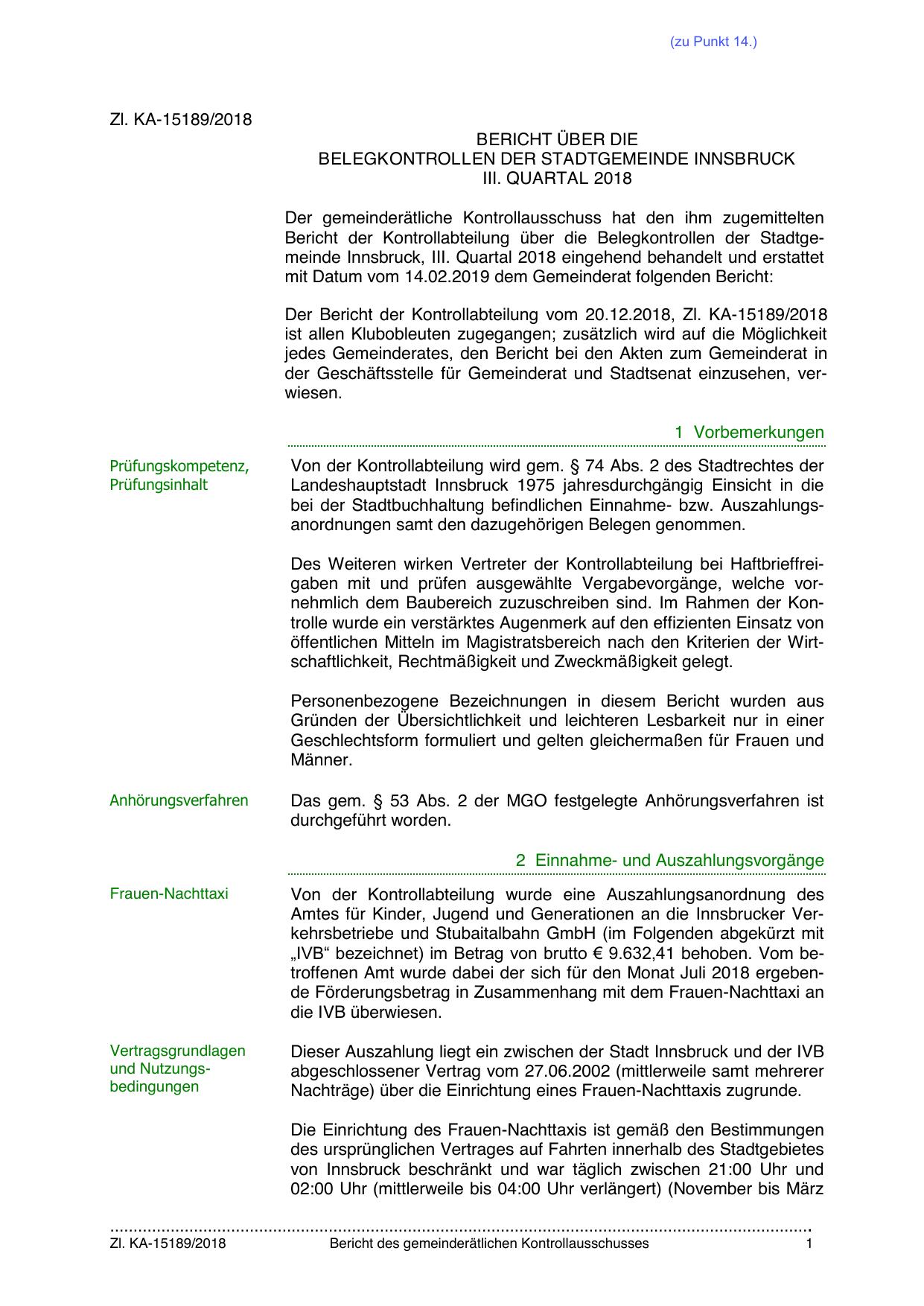 Bericht der Kontrollabteilung über die Belegkontrollen der Stadtgemeinde Innsbruck, III. Quartal 2018 eingehend behandelt und erstattet
