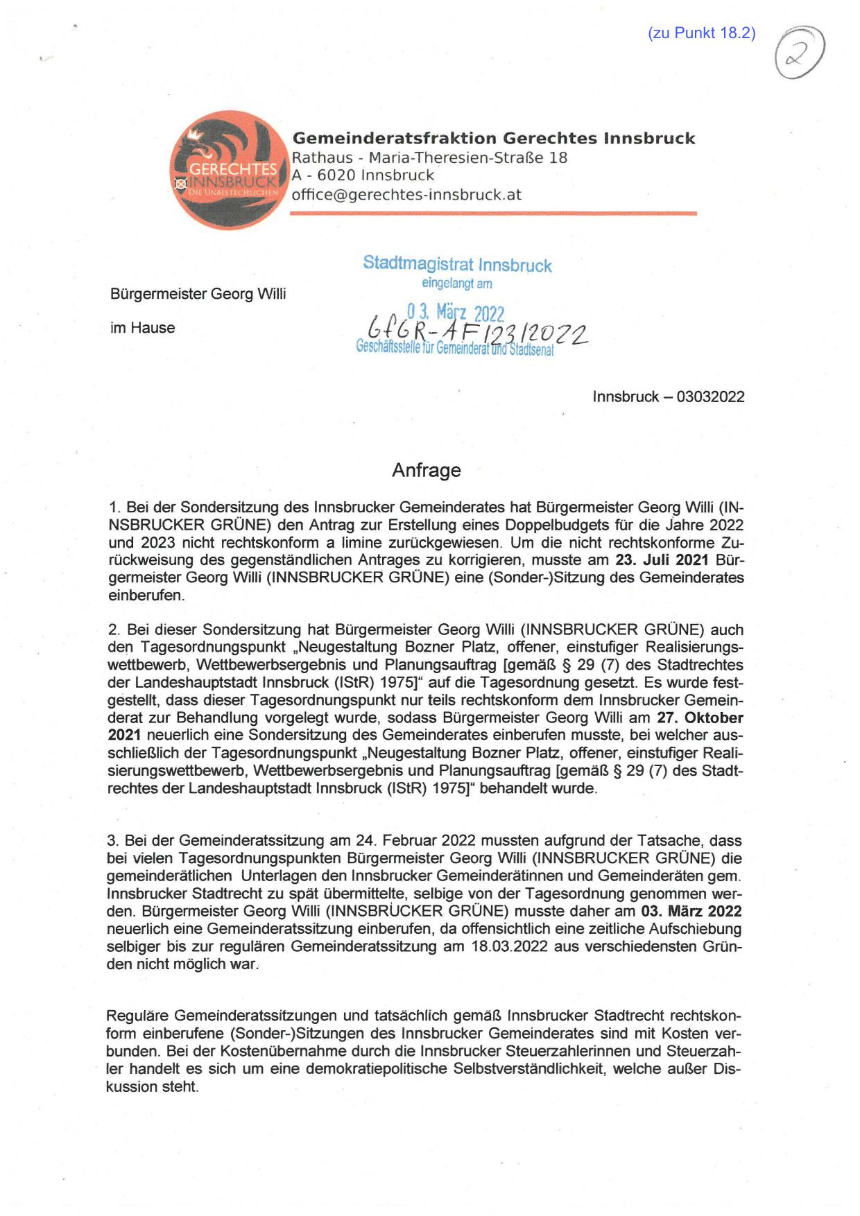 lnnsbrucker Stadtrecht zu spät übermittelte, selbige von der Tagesordnung genommen werden. Bürgermeister Georg Willi (INNSBRÜCKER GRÜNE) musste daher am 03. März 2022