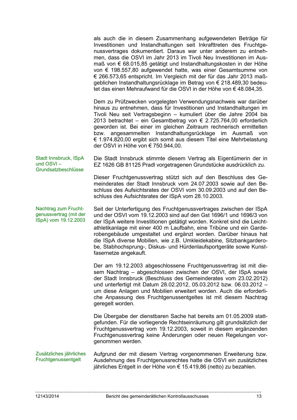 Dieser Fruchtgenussvertrag stützt sich auf den Beschluss des Gemeinderates der Stadt Innsbruck vom 24.07.2003 sowie auf den Beschluss des Aufsichtsrates der OSVI vom 30.09.2003 und auf den Beschluss des Aufsichtsrates der ISpA vom 28.10.2003.