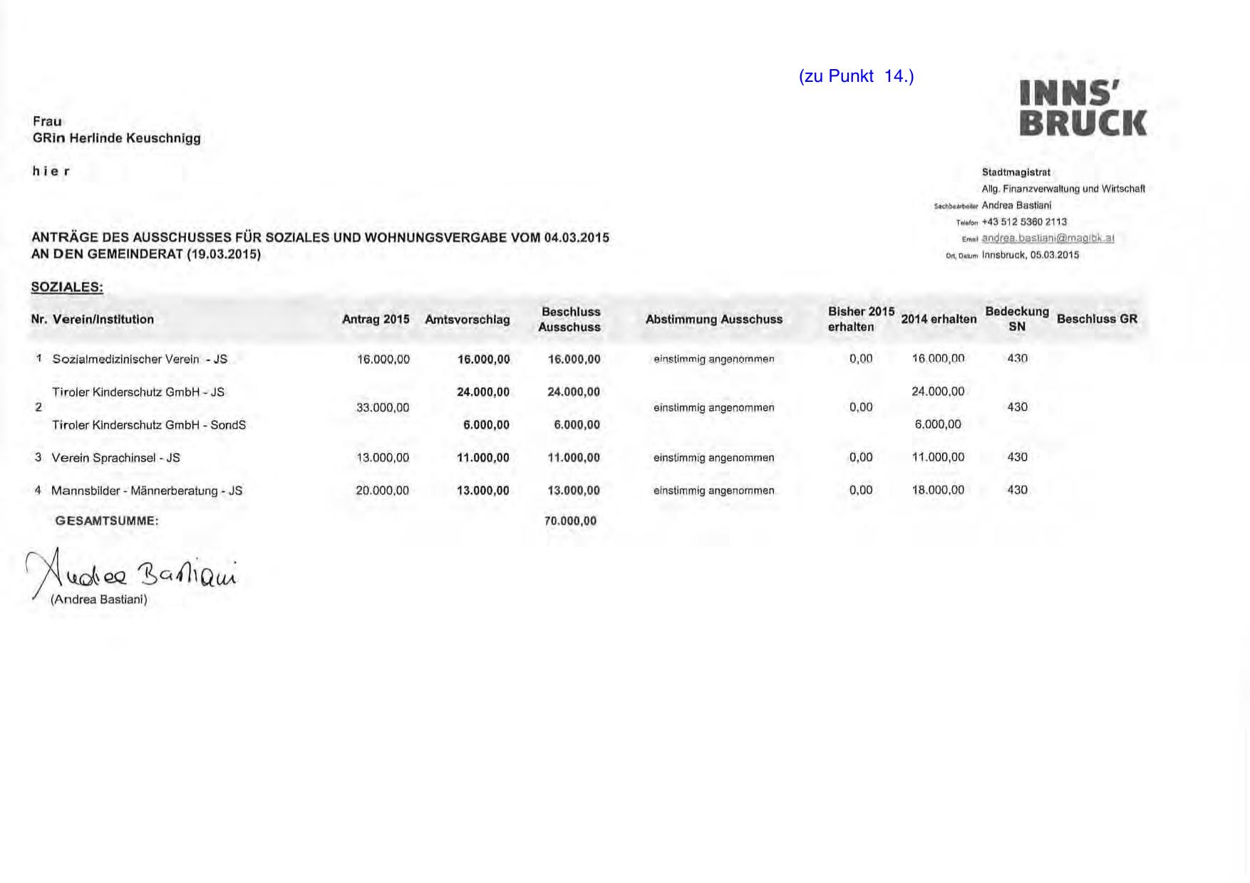 ANTRÄGE DES AUSSCHUSSES FÜR SOZIALES UND WOHNUNGSVERGABE VOM 04.03.2015