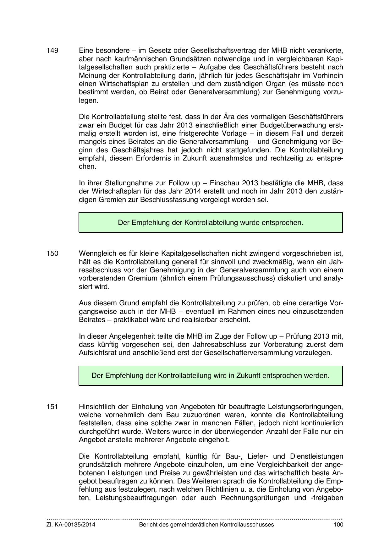 In dieser Angelegenheit teilte die MHB im Zuge der Follow up – Prüfung 2013 mit,