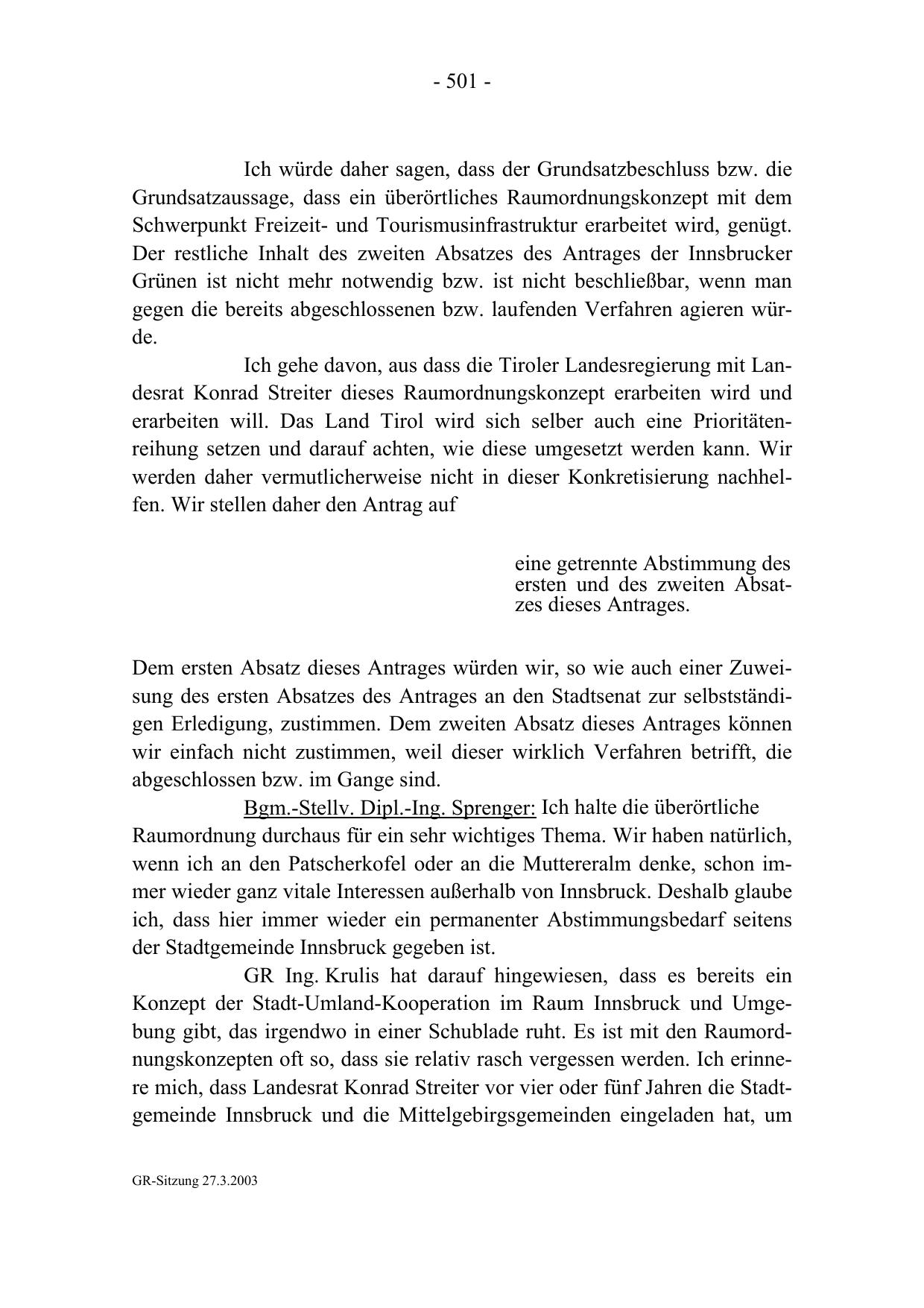 Konzept der Stadt-Umland-Kooperation im Raum Innsbruck und Umgebung gibt, das irgendwo in einer Schublade ruht. Es ist mit den Raumordnungskonzepten oft so, dass sie relativ rasch vergessen werden. Ich erinnere mich, dass Landesrat Konrad Streiter vor vier oder fünf Jahren die Stadtgemeinde Innsbruck und die Mittelgebirgsgemeinden eingeladen hat, um