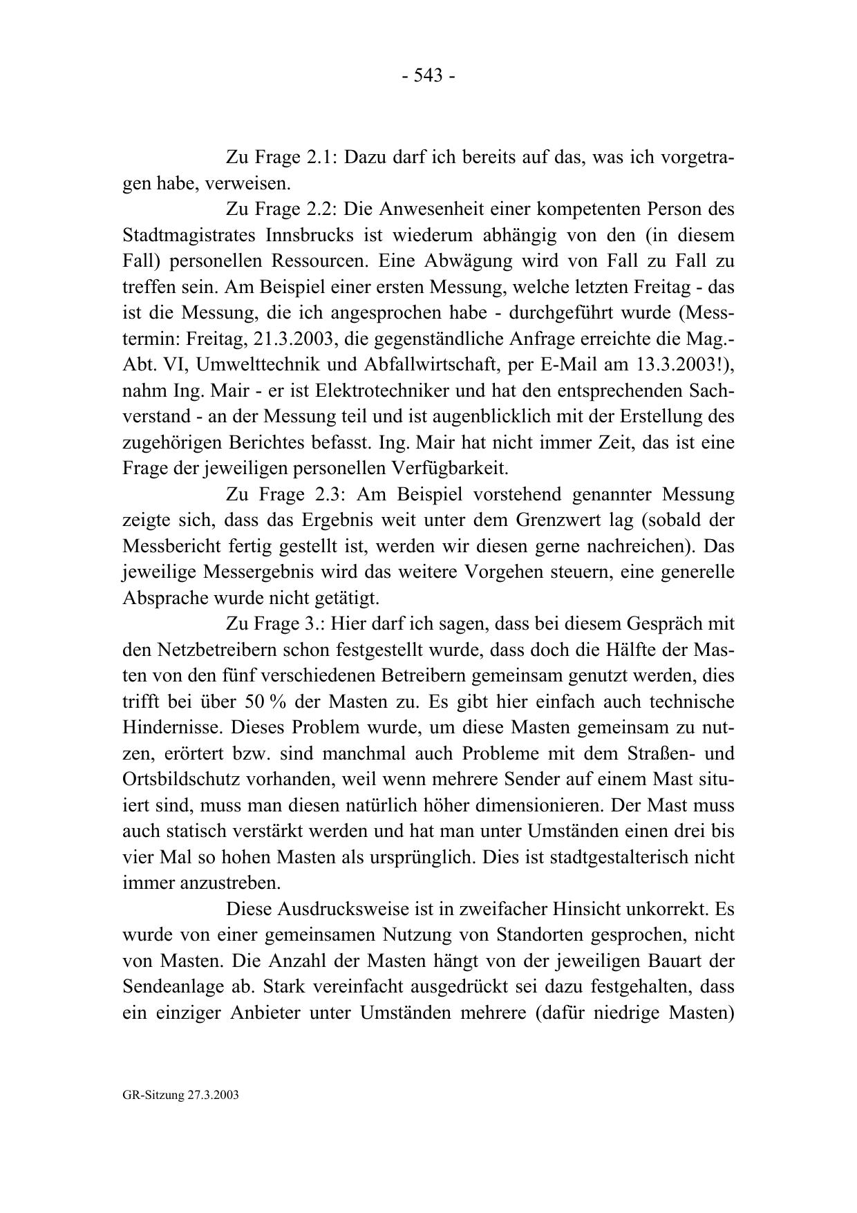 ist die Messung, die ich angesprochen habe - durchgeführt wurde (Messtermin: Freitag, 21.3.2003, die gegenständliche Anfrage erreichte die Mag.Abt. VI, Umwelttechnik und Abfallwirtschaft, per E-Mail am 13.3.2003!),