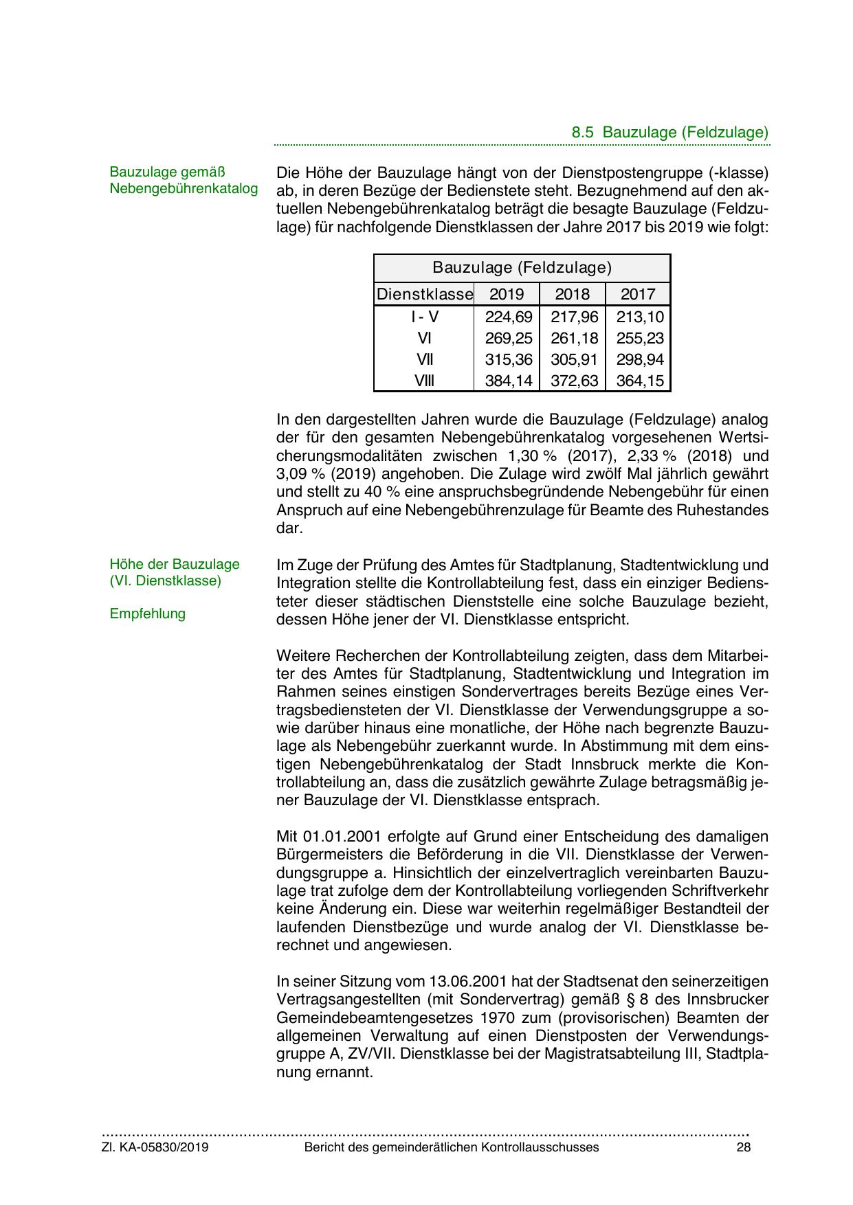 Rahmen seines einstigen Sondervertrages bereits Bezüge eines Vertragsbediensteten der VI. Dienstklasse der Verwendungsgruppe a sowie darüber hinaus eine monatliche, der Höhe nach begrenzte Bauzulage als Nebengebühr zuerkannt wurde. In Abstimmung mit dem einstigen Nebengebührenkatalog der Stadt Innsbruck merkte die Kontrollabteilung an, dass die zusätzlich gewährte Zulage betragsmäßig jener Bauzulage der VI. Dienstklasse entsprach.
