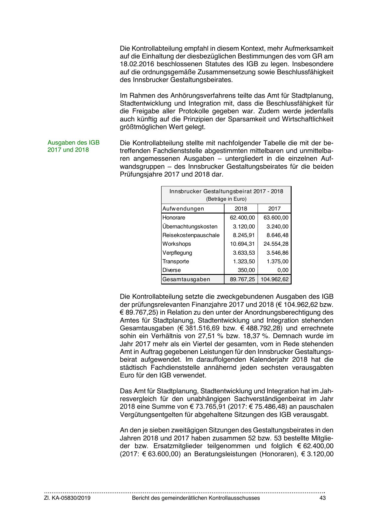 Amt in Auftrag gegebenen Leistungen für den Innsbrucker Gestaltungsbeirat aufgewendet. Im darauffolgenden Kalenderjahr 2018 hat die