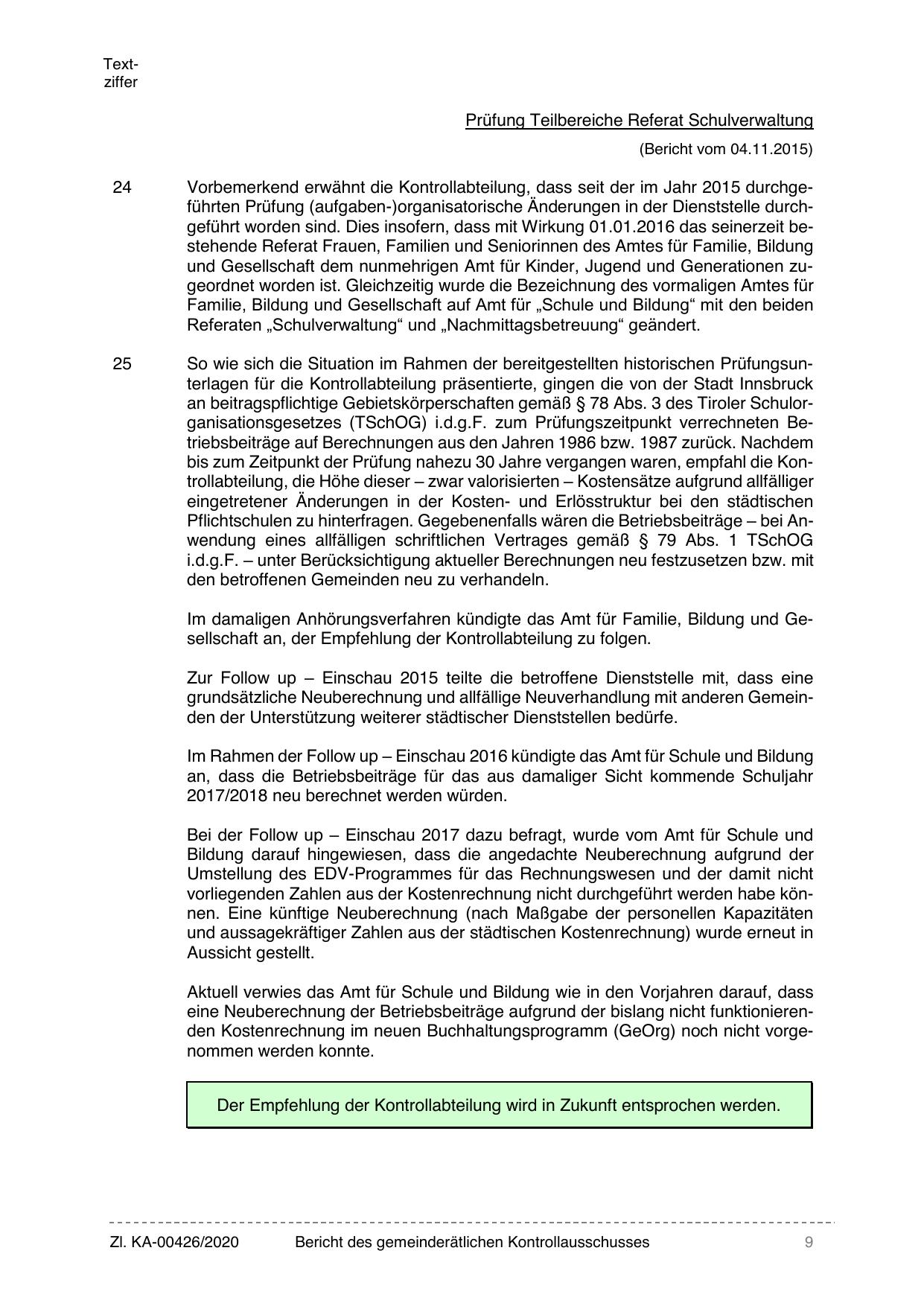 Zur Follow up – Einschau 2015 teilte die betroffene Dienststelle mit, dass eine