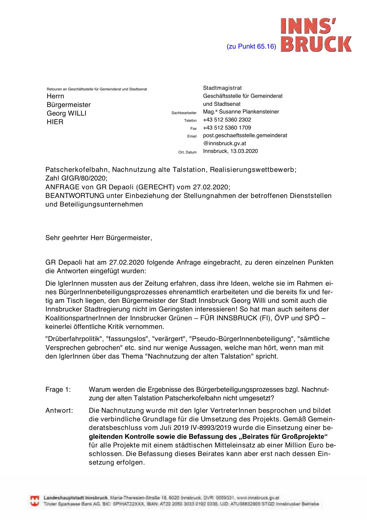 ANFRAGE von GR Depaoli (GERECHT) vom 27.02.2020;
