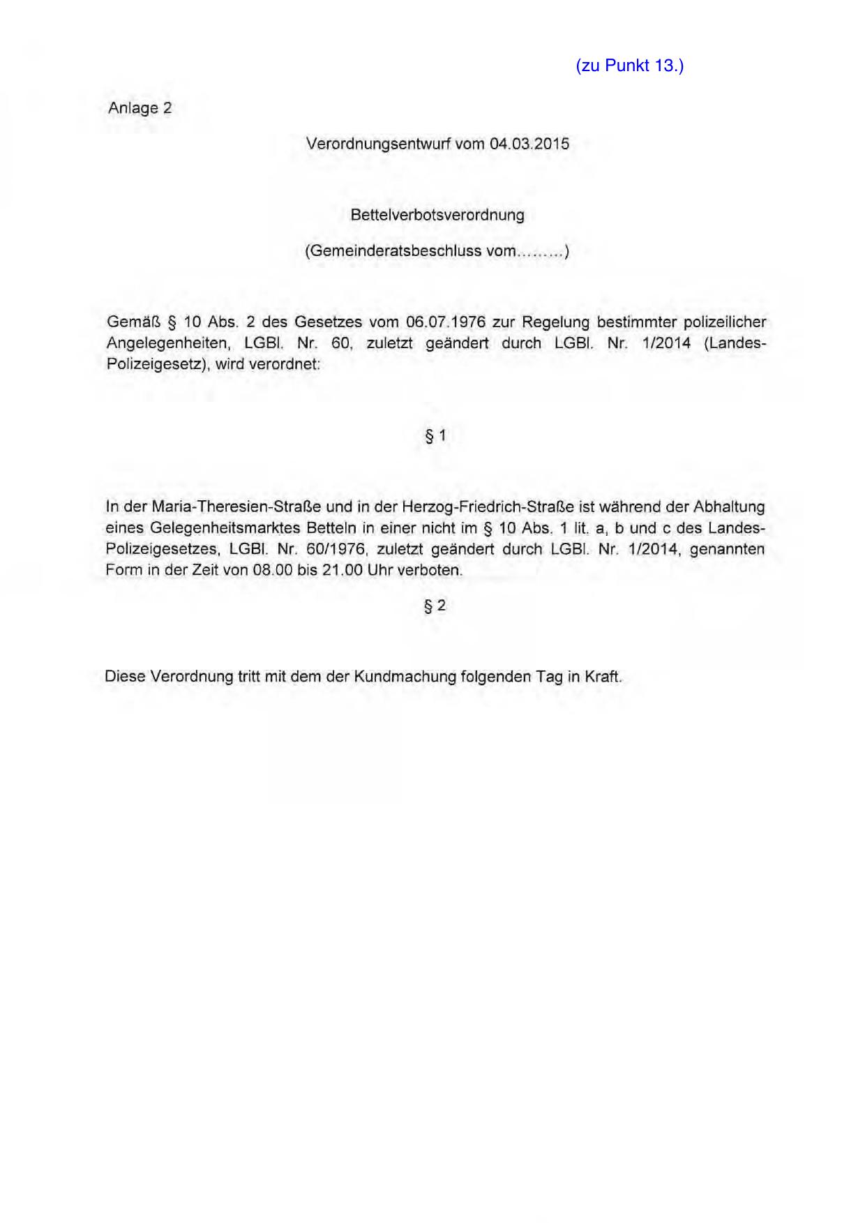 eines Gelegenheitsmarktes Betteln in einer nicht im § 10 Abs. 1 lit. a, bund c des LandesPolizeigesetzes , LGB I. Nr. 60/1976, zuletzt geändert durch LGB I. Nr. 1/2014, genannten