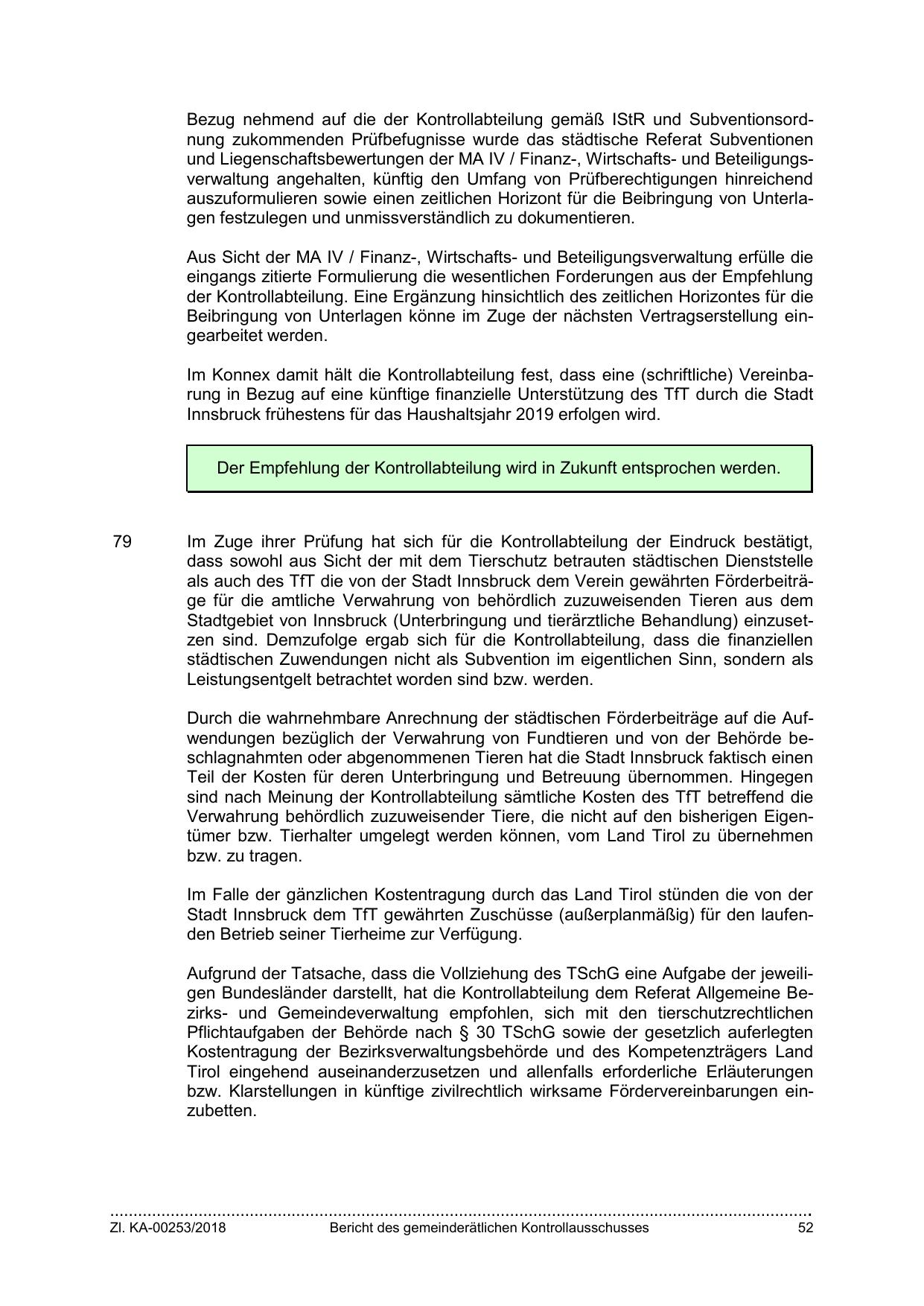Stadt Innsbruck dem TfT gewährten Zuschüsse (außerplanmäßig) für den laufenden Betrieb seiner Tierheime zur Verfügung.