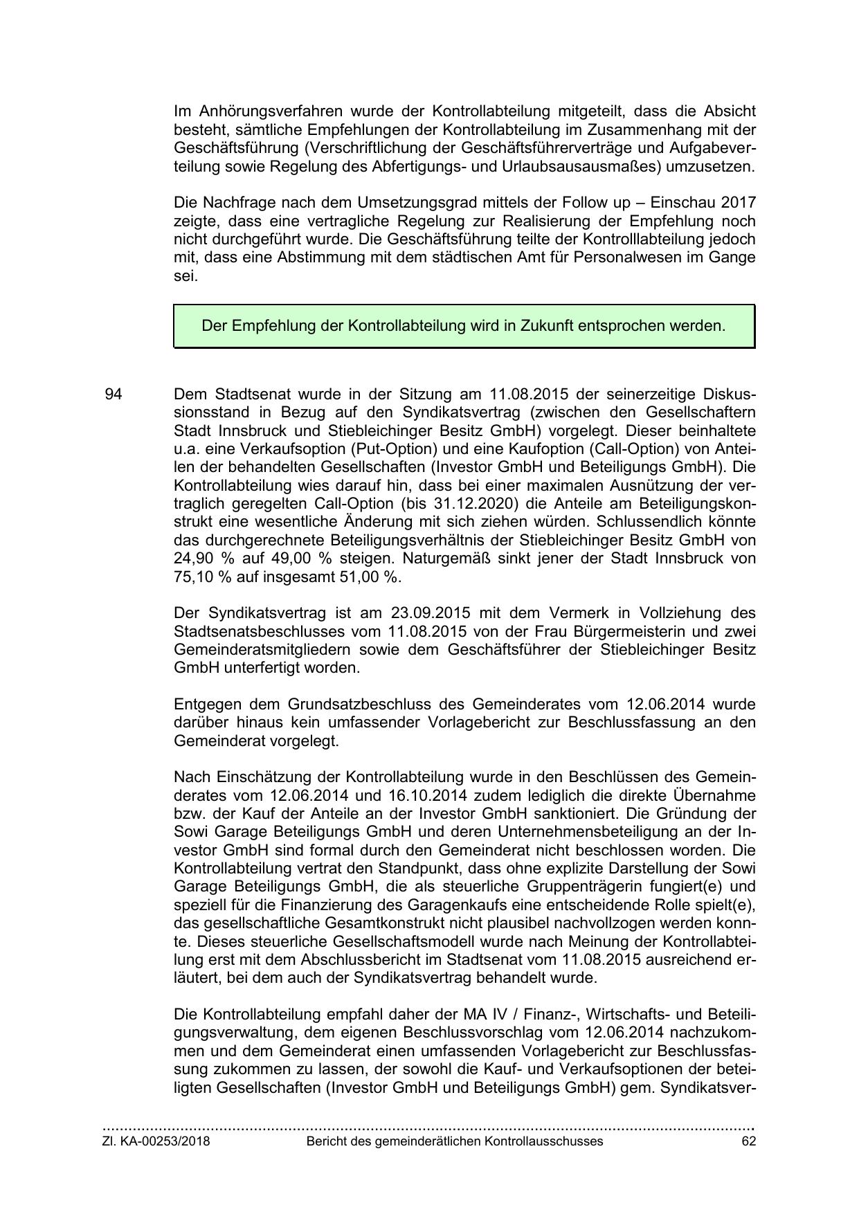 Die Kontrollabteilung empfahl daher der MA IV / Finanz-, Wirtschafts- und Beteiligungsverwaltung, dem eigenen Beschlussvorschlag vom 12.06.2014 nachzukommen und dem Gemeinderat einen umfassenden Vorlagebericht zur Beschlussfassung zukommen zu lassen, der sowohl die Kauf- und Verkaufsoptionen der beteiligten Gesellschaften (Investor GmbH und Beteiligungs GmbH) gem. Syndikatsver-