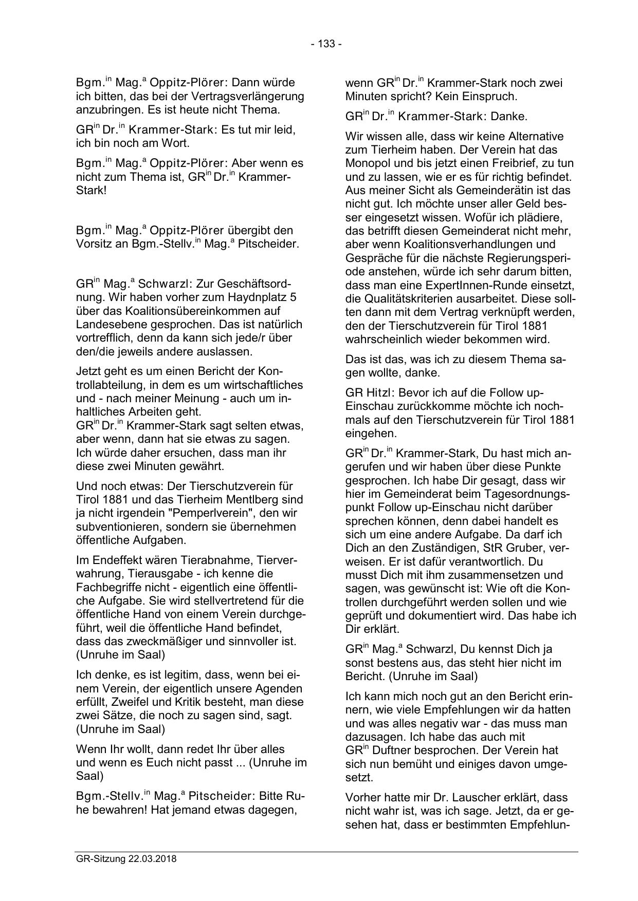 GR Hitzl: Bevor ich auf die Follow upEinschau zurückkomme möchte ich nochmals auf den Tierschutzverein für Tirol 1881