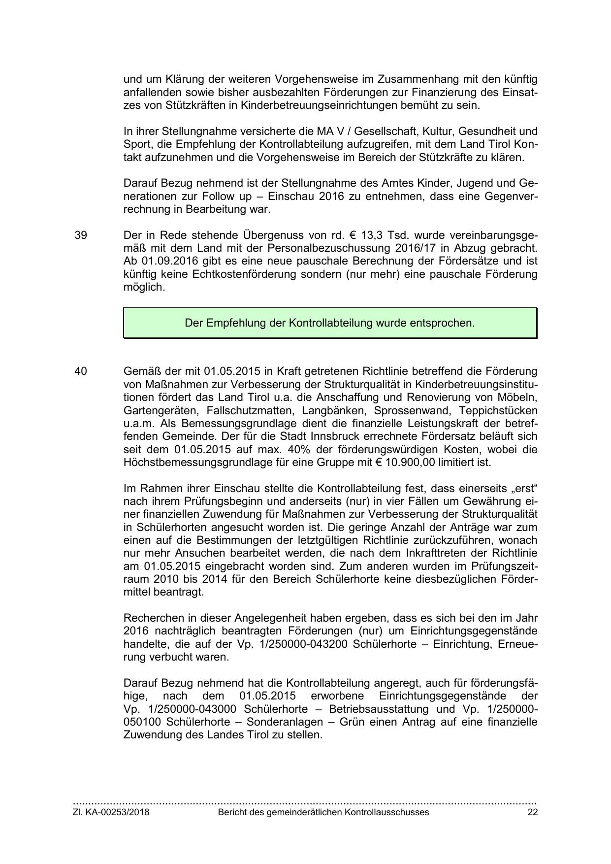 Sport, die Empfehlung der Kontrollabteilung aufzugreifen, mit dem Land Tirol Kontakt aufzunehmen und die Vorgehensweise im Bereich der Stützkräfte zu klären.