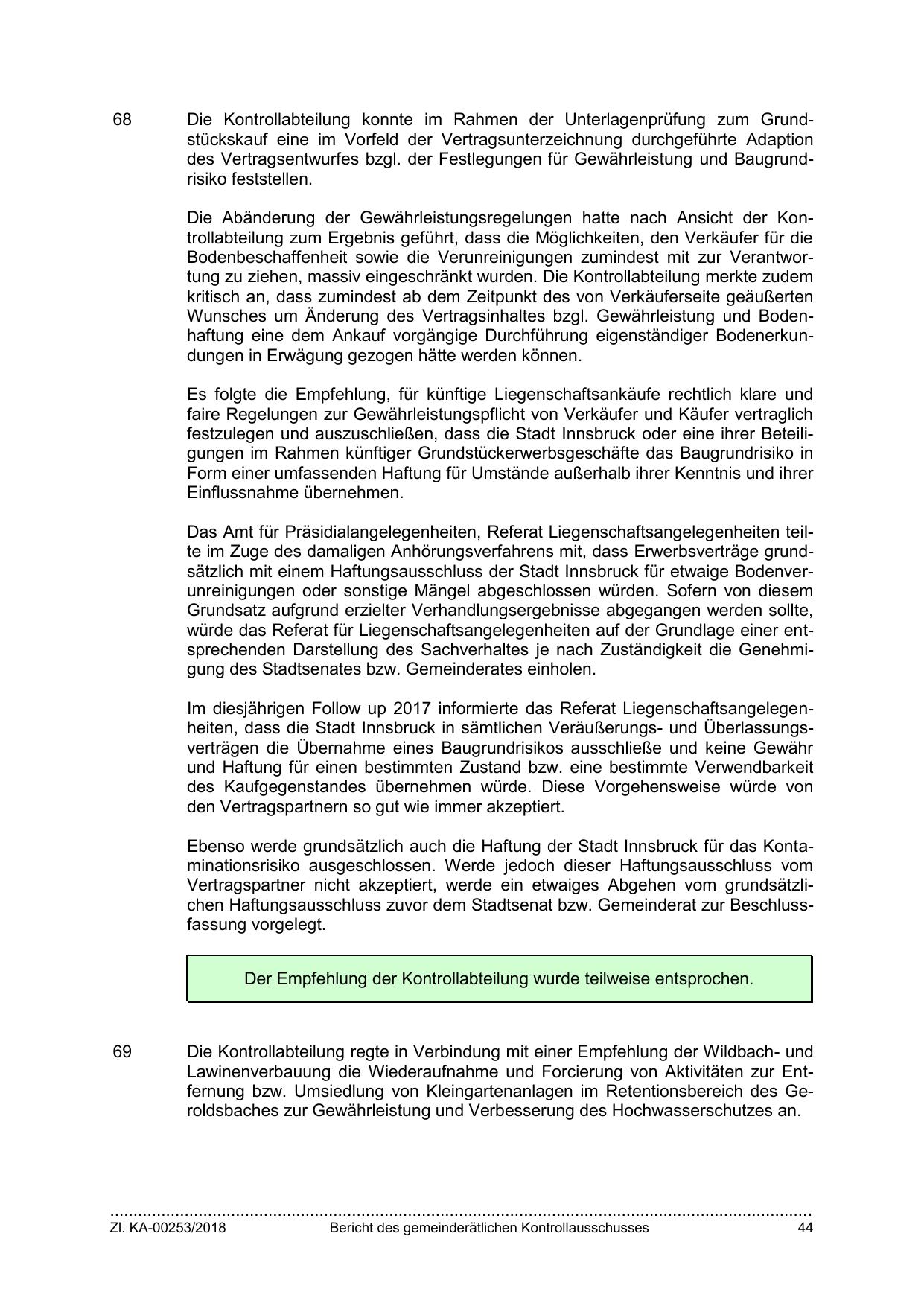 Im diesjährigen Follow up 2017 informierte das Referat Liegenschaftsangelegenheiten, dass die Stadt Innsbruck in sämtlichen Veräußerungs- und Überlassungsverträgen die Übernahme eines Baugrundrisikos ausschließe und keine Gewähr