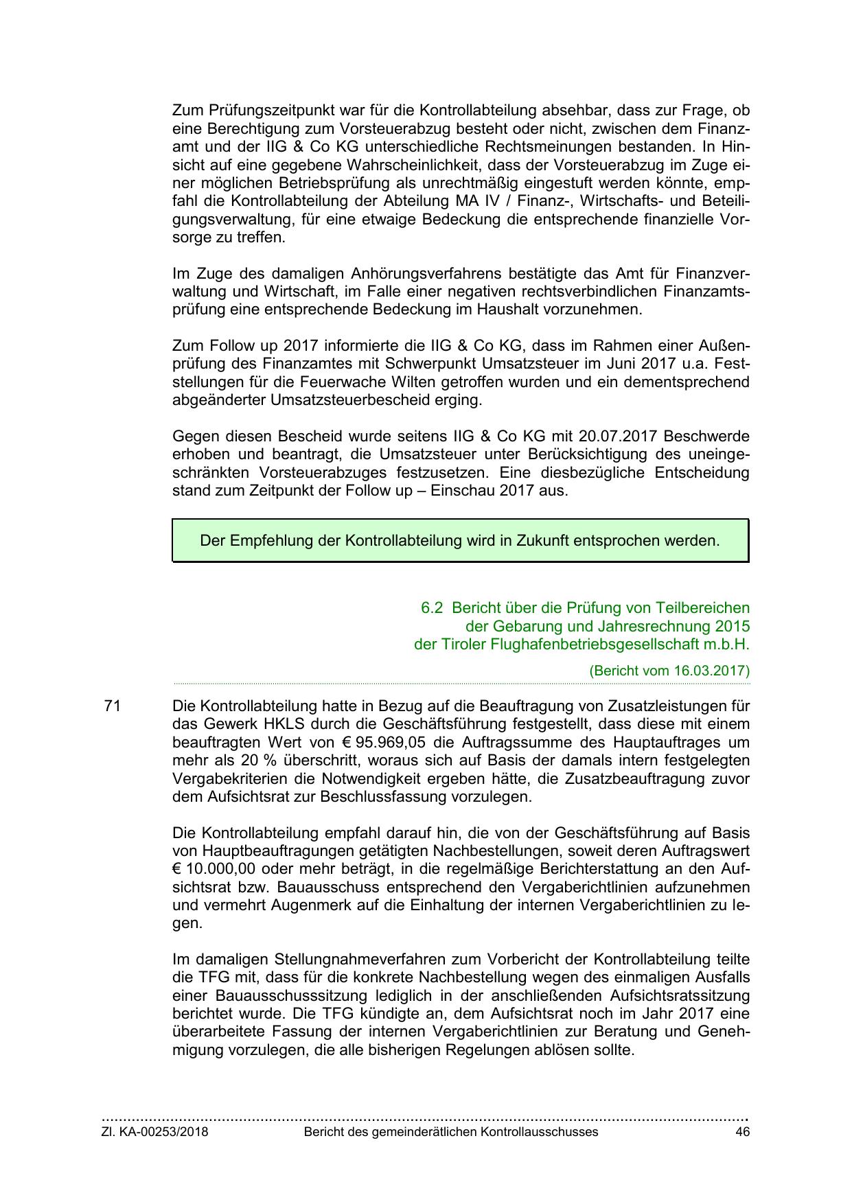 eine Berechtigung zum Vorsteuerabzug besteht oder nicht, zwischen dem Finanzamt und der IIG & Co KG unterschiedliche Rechtsmeinungen bestanden. In Hinsicht auf eine gegebene Wahrscheinlichkeit, dass der Vorsteuerabzug im Zuge einer möglichen Betriebsprüfung als unrechtmäßig eingestuft werden könnte, empfahl die Kontrollabteilung der Abteilung MA IV / Finanz-, Wirtschafts- und Beteiligungsverwaltung, für eine etwaige Bedeckung die entsprechende finanzielle Vorsorge zu treffen.