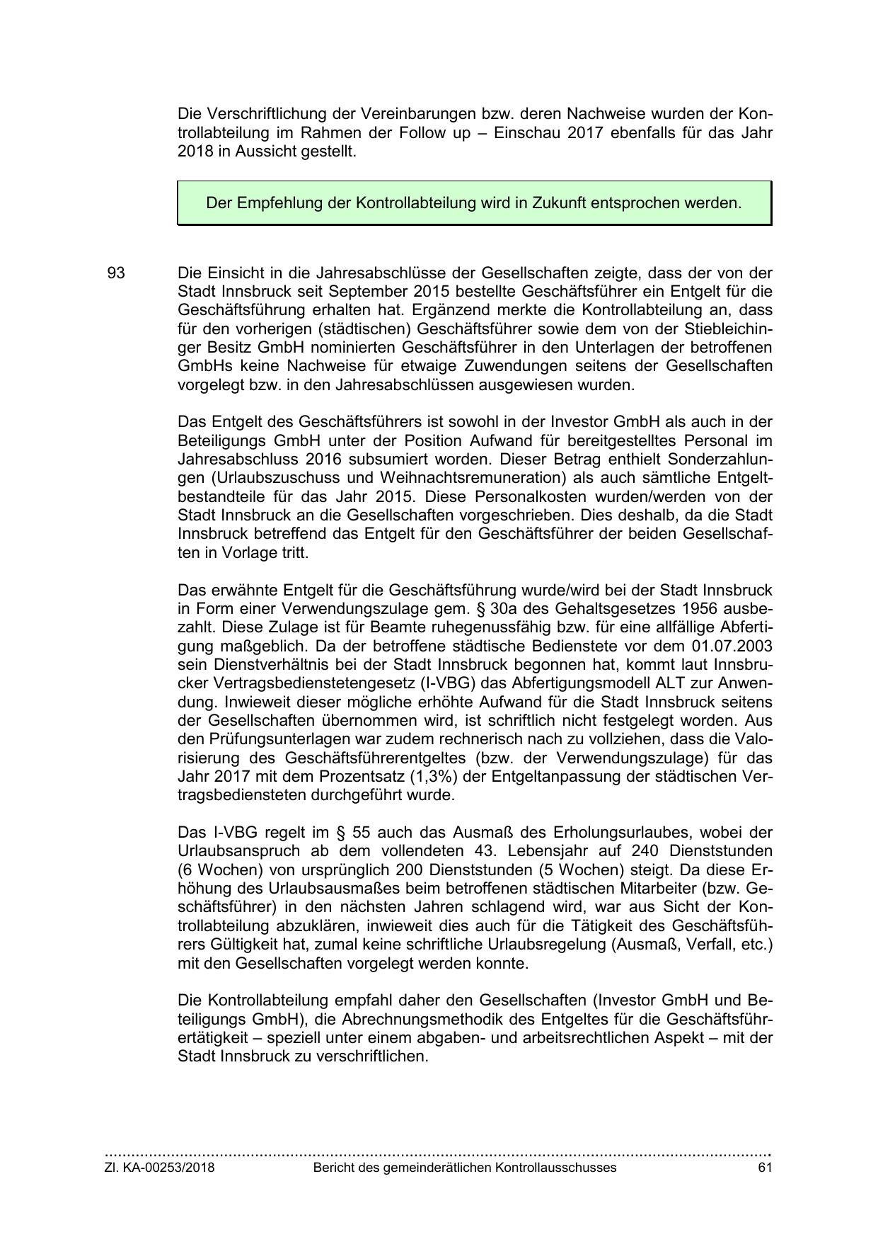 Stadt Innsbruck seit September 2015 bestellte Geschäftsführer ein Entgelt für die