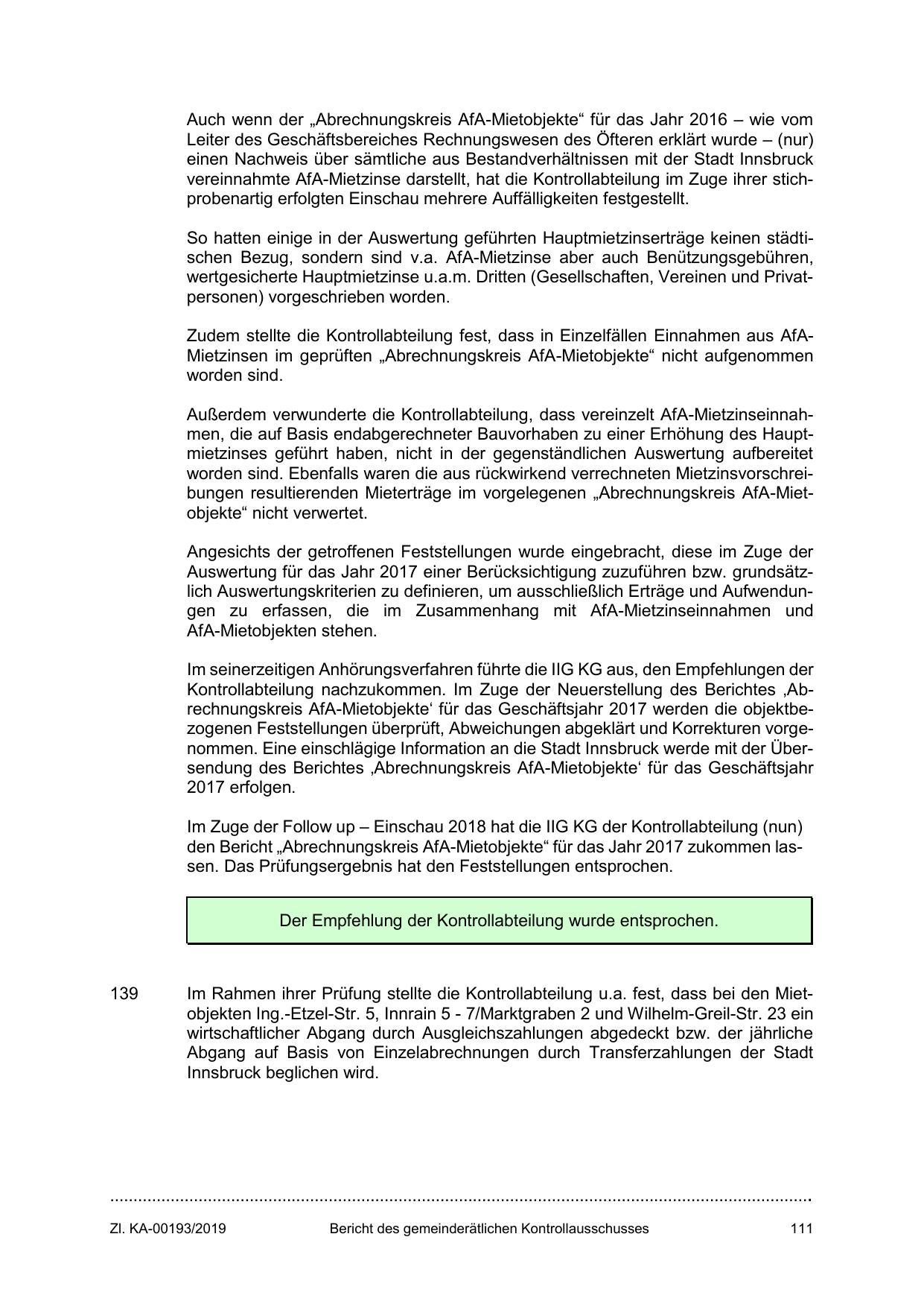 Kontrollabteilung nachzukommen. Im Zuge der Neuerstellung des Berichtes ‚Abrechnungskreis AfA-Mietobjekte‘ für das Geschäftsjahr 2017 werden die objektbezogenen Feststellungen überprüft, Abweichungen abgeklärt und Korrekturen vorgenommen. Eine einschlägige Information an die Stadt Innsbruck werde mit der Übersendung des Berichtes ‚Abrechnungskreis AfA-Mietobjekte‘ für das Geschäftsjahr