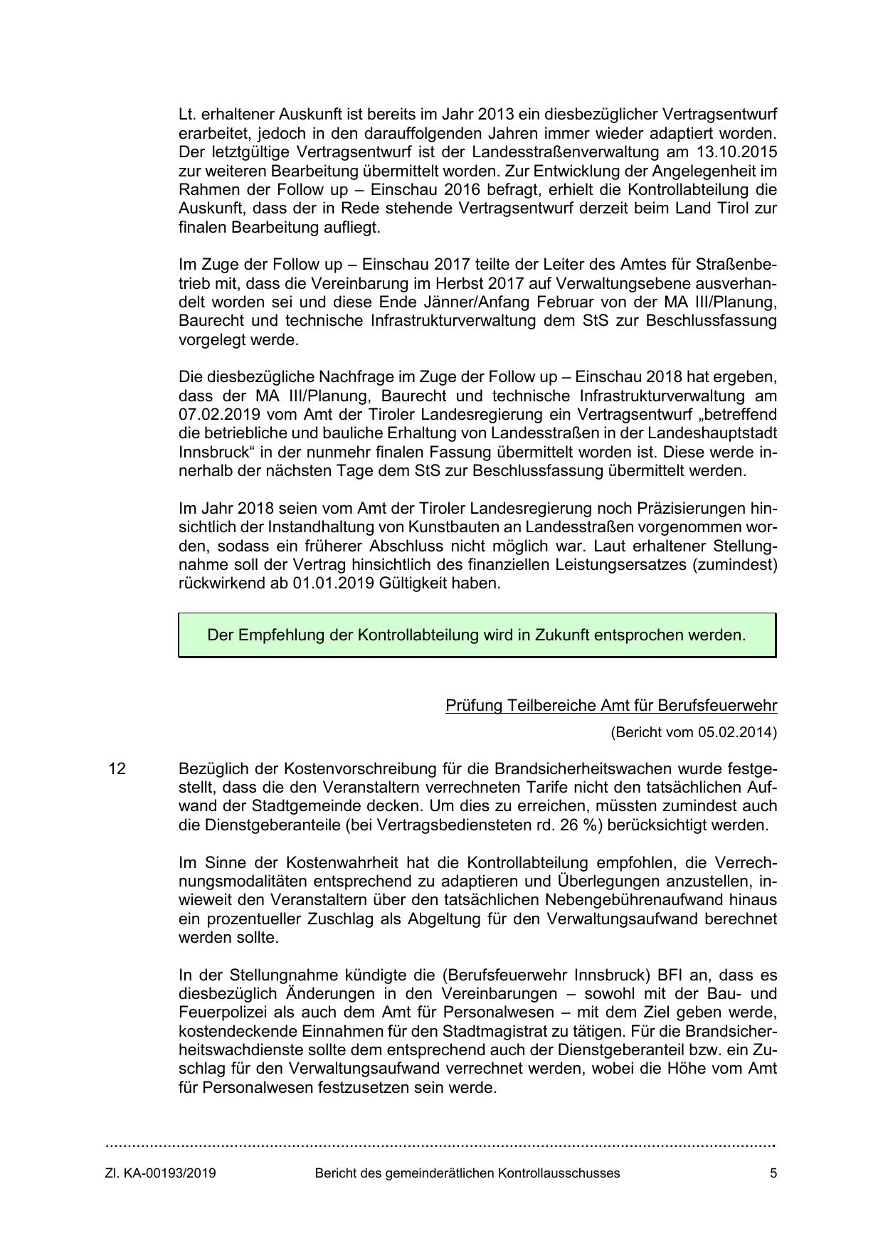 Im Jahr 2018 seien vom Amt der Tiroler Landesregierung noch Präzisierungen hinsichtlich der Instandhaltung von Kunstbauten an Landesstraßen vorgenommen worden, sodass ein früherer Abschluss nicht möglich war. Laut erhaltener Stellungnahme soll der Vertrag hinsichtlich des finanziellen Leistungsersatzes (zumindest)