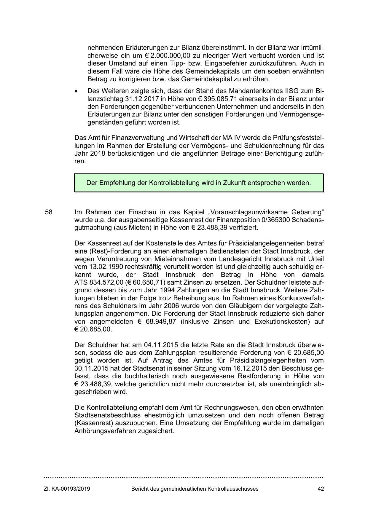 Das Amt für Finanzverwaltung und Wirtschaft der MA IV werde die Prüfungsfeststellungen im Rahmen der Erstellung der Vermögens- und Schuldenrechnung für das