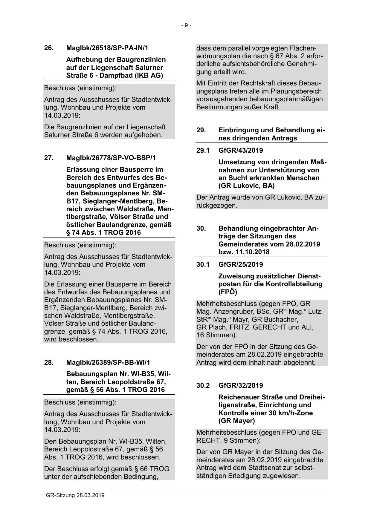 Mehrheitsbeschluss (gegen FPÖ und GERECHT, 9 Stimmen):
