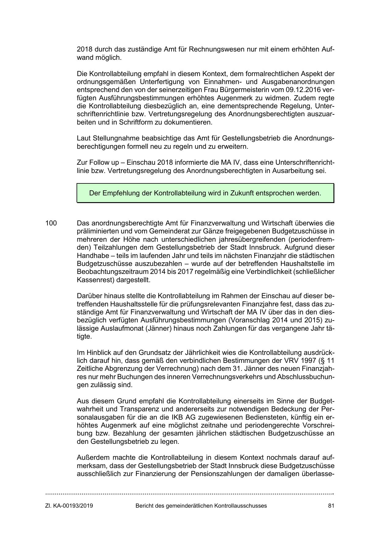 Aus diesem Grund empfahl die Kontrollabteilung einerseits im Sinne der Budgetwahrheit und Transparenz und andererseits zur notwendigen Bedeckung der Personalausgaben für die an die IKB AG zugewiesenen Bediensteten, künftig ein erhöhtes Augenmerk auf eine möglichst zeitnahe und periodengerechte Vorschreibung bzw. Bezahlung der gesamten jährlichen städtischen Budgetzuschüsse an