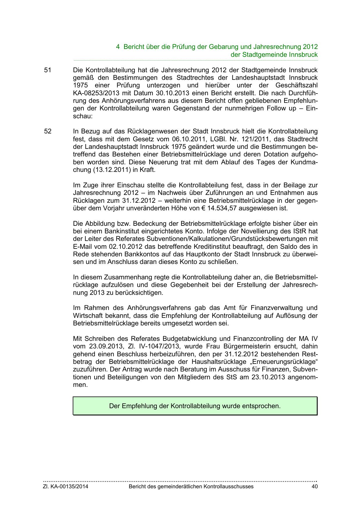 In diesem Zusammenhang regte die Kontrollabteilung daher an, die Betriebsmittelrücklage aufzulösen und diese Gegebenheit bei der Erstellung der Jahresrechnung 2013 zu berücksichtigen.