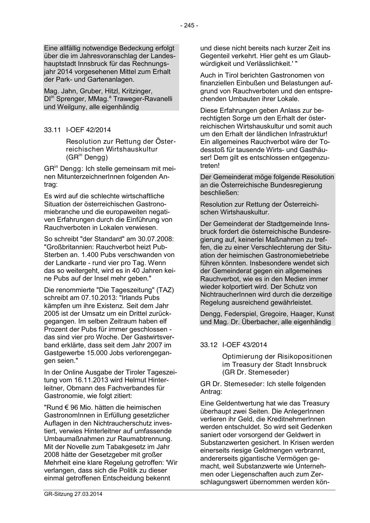 Der Gemeinderat der Stadtgemeinde Innsbruck fordert die österreichische Bundesregierung auf, keinerlei Maßnahmen zu treffen, die zu einer Verschlechterung der Situation der heimischen Gastronomiebetriebe