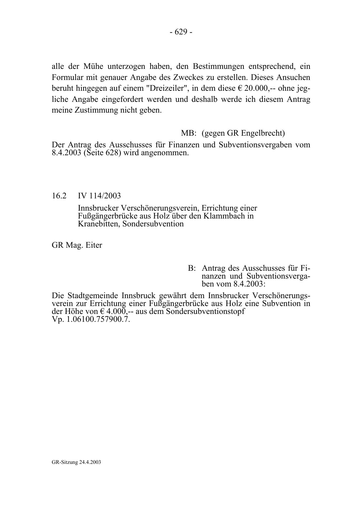 B: Antrag des Ausschusses für Finanzen und Subventionsvergaben vom 8.4.2003: