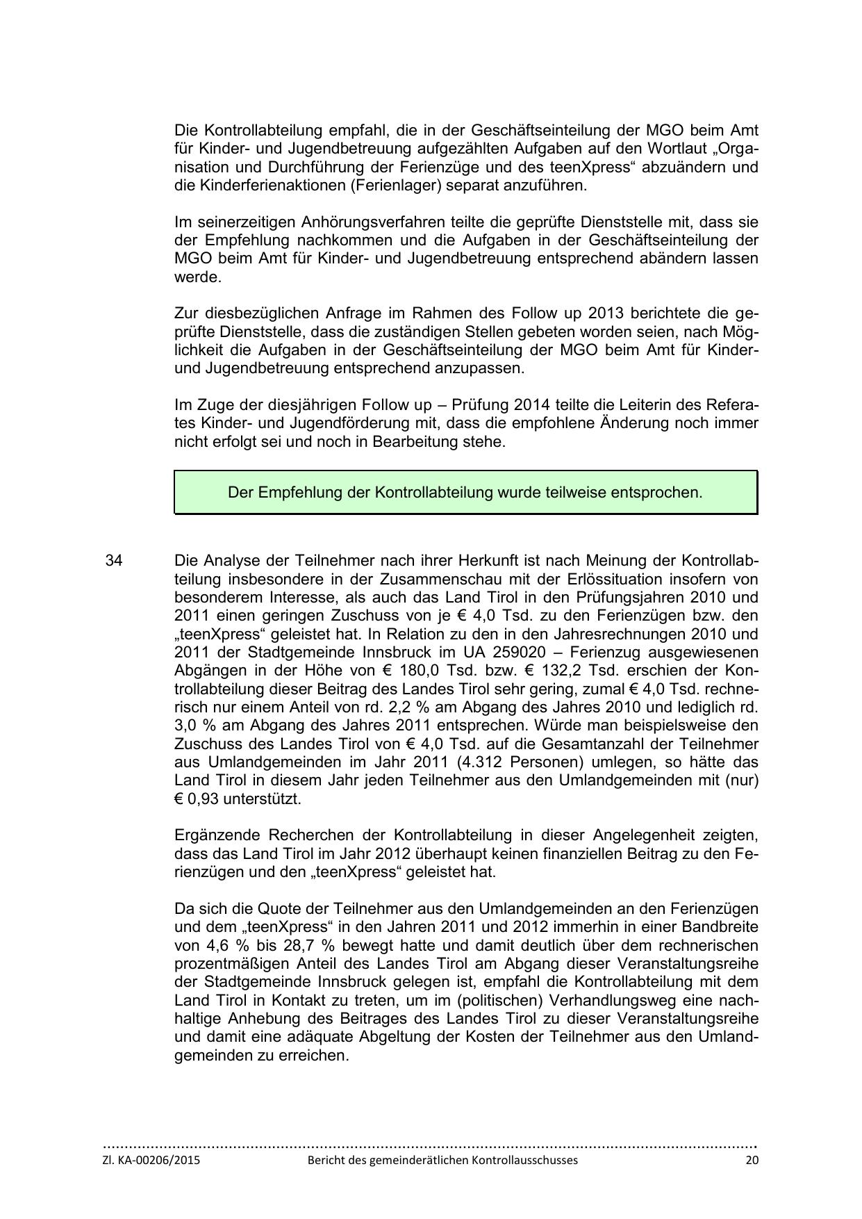 Im Zuge der diesjährigen Follow up – Prüfung 2014 teilte die Leiterin des Referates Kinder- und Jugendförderung mit, dass die empfohlene Änderung noch immer