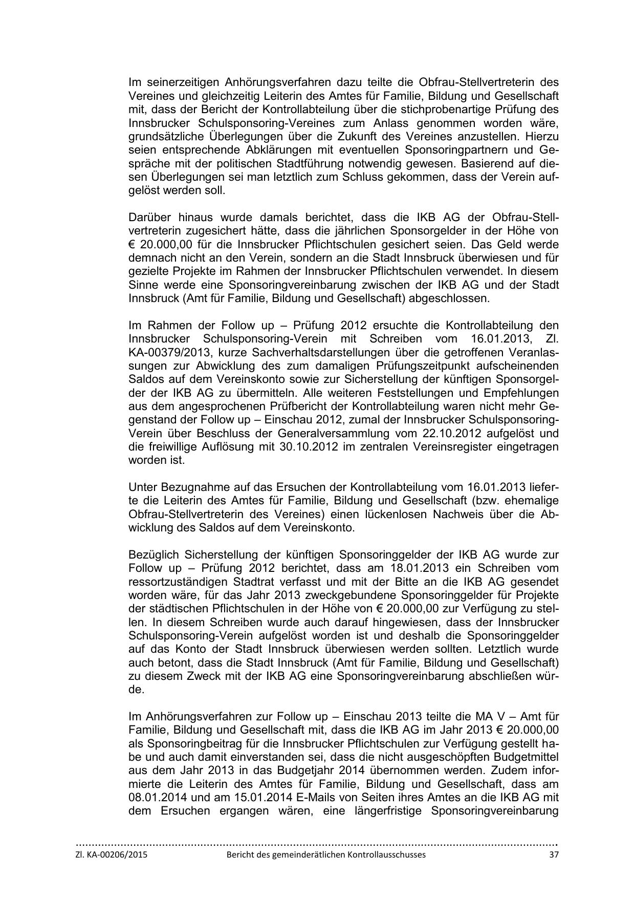 aus dem angesprochenen Prüfbericht der Kontrollabteilung waren nicht mehr Gegenstand der Follow up – Einschau 2012, zumal der Innsbrucker SchulsponsoringVerein über Beschluss der Generalversammlung vom 22.10.2012 aufgelöst und