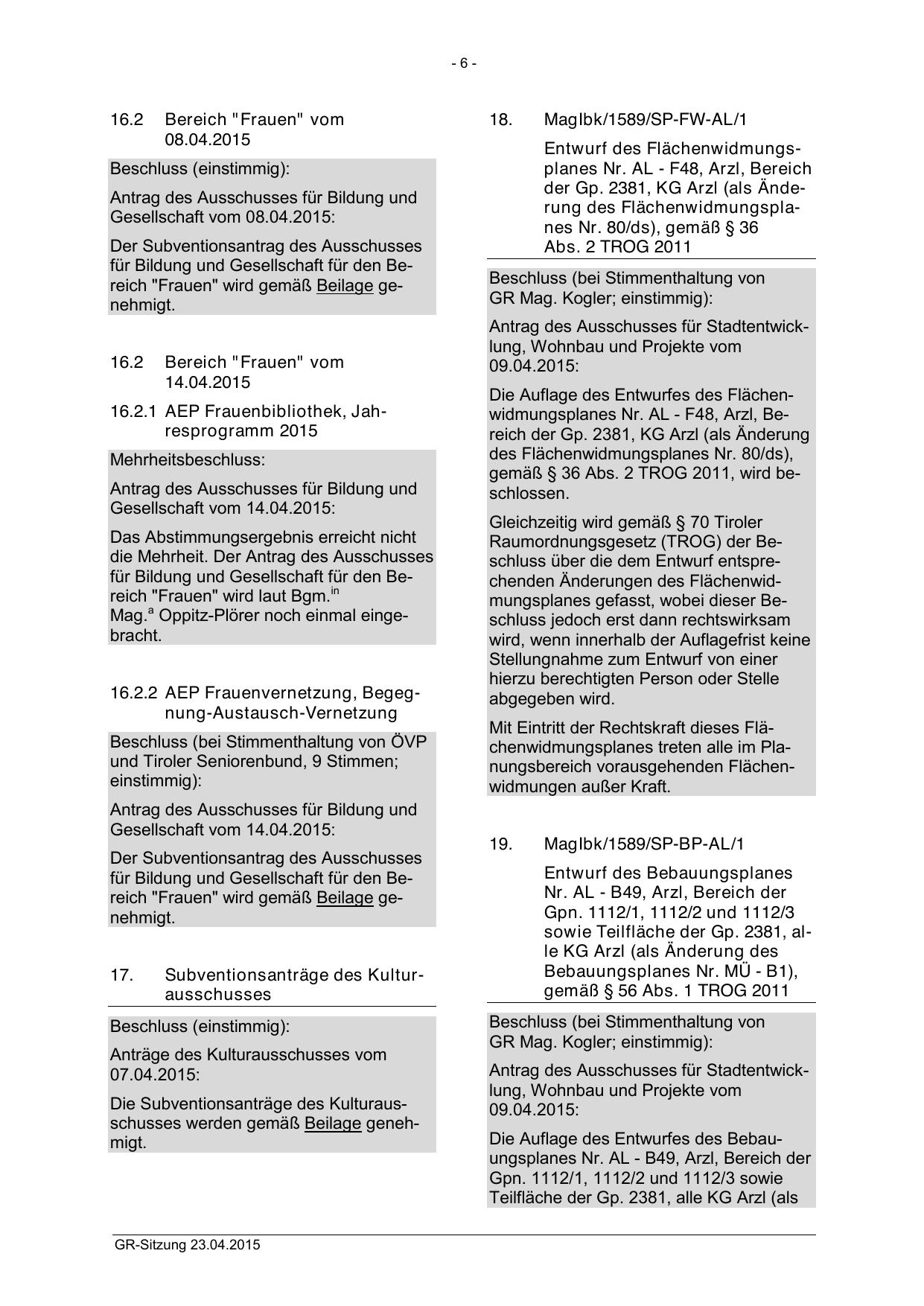 Raumordnungsgesetz (TROG) der Beschluss über die dem Entwurf entsprechenden Änderungen des Flächenwidmungsplanes gefasst, wobei dieser Beschluss jedoch erst dann rechtswirksam