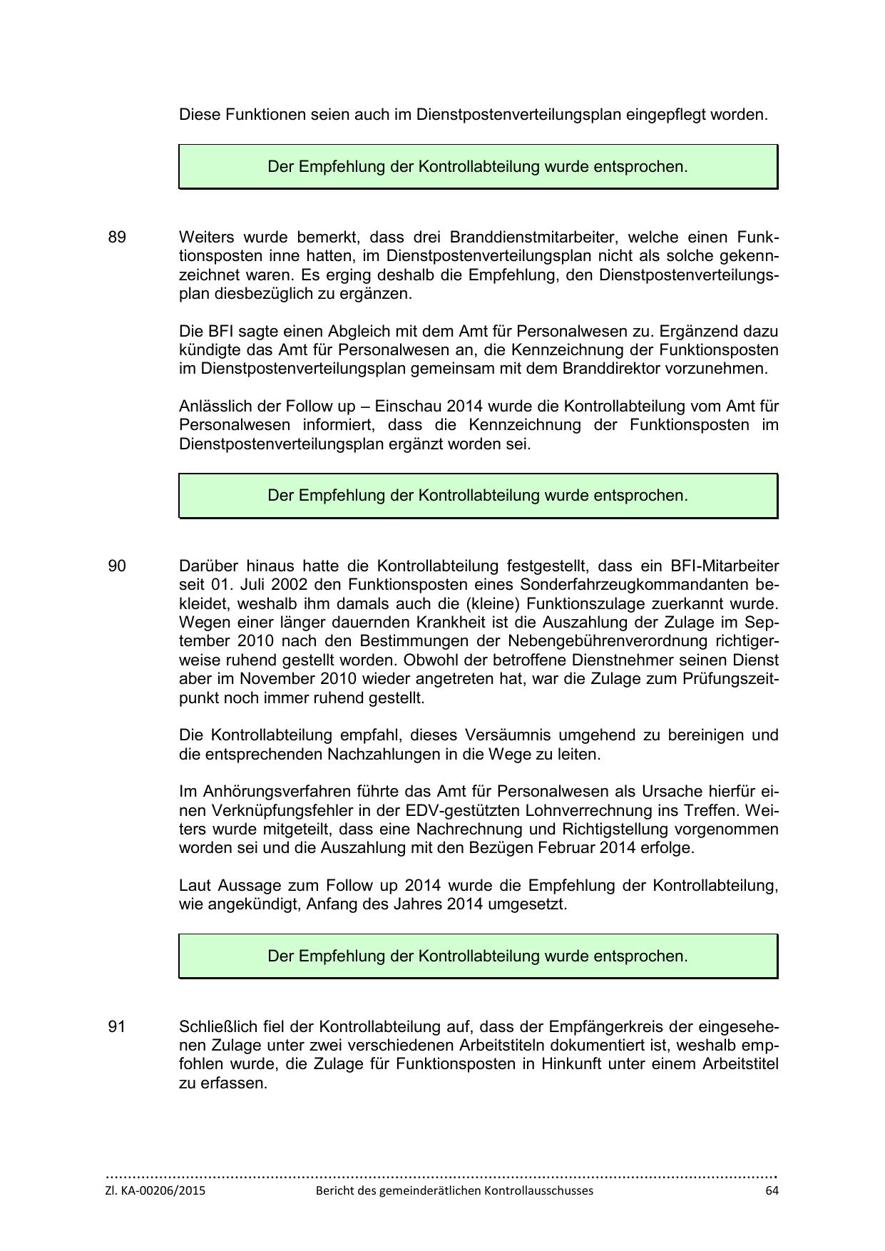 Weiters wurde bemerkt, dass drei Branddienstmitarbeiter, welche einen Funktionsposten inne hatten, im Dienstpostenverteilungsplan nicht als solche gekennzeichnet waren. Es erging deshalb die Empfehlung, den Dienstpostenverteilungsplan diesbezüglich zu ergänzen.