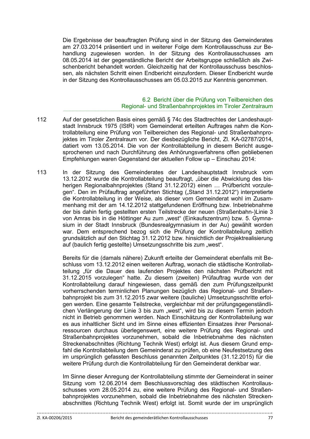 Auf der gesetzlichen Basis eines gemäß § 74c des Stadtrechtes der Landeshauptstadt Innsbruck 1975 (IStR) vom Gemeinderat erteilten Auftrages nahm die Kontrollabteilung eine Prüfung von Teilbereichen des Regional- und Straßenbahnprojektes im Tiroler Zentralraum vor. Der diesbezügliche Bericht, Zl. KA-02787/2014,