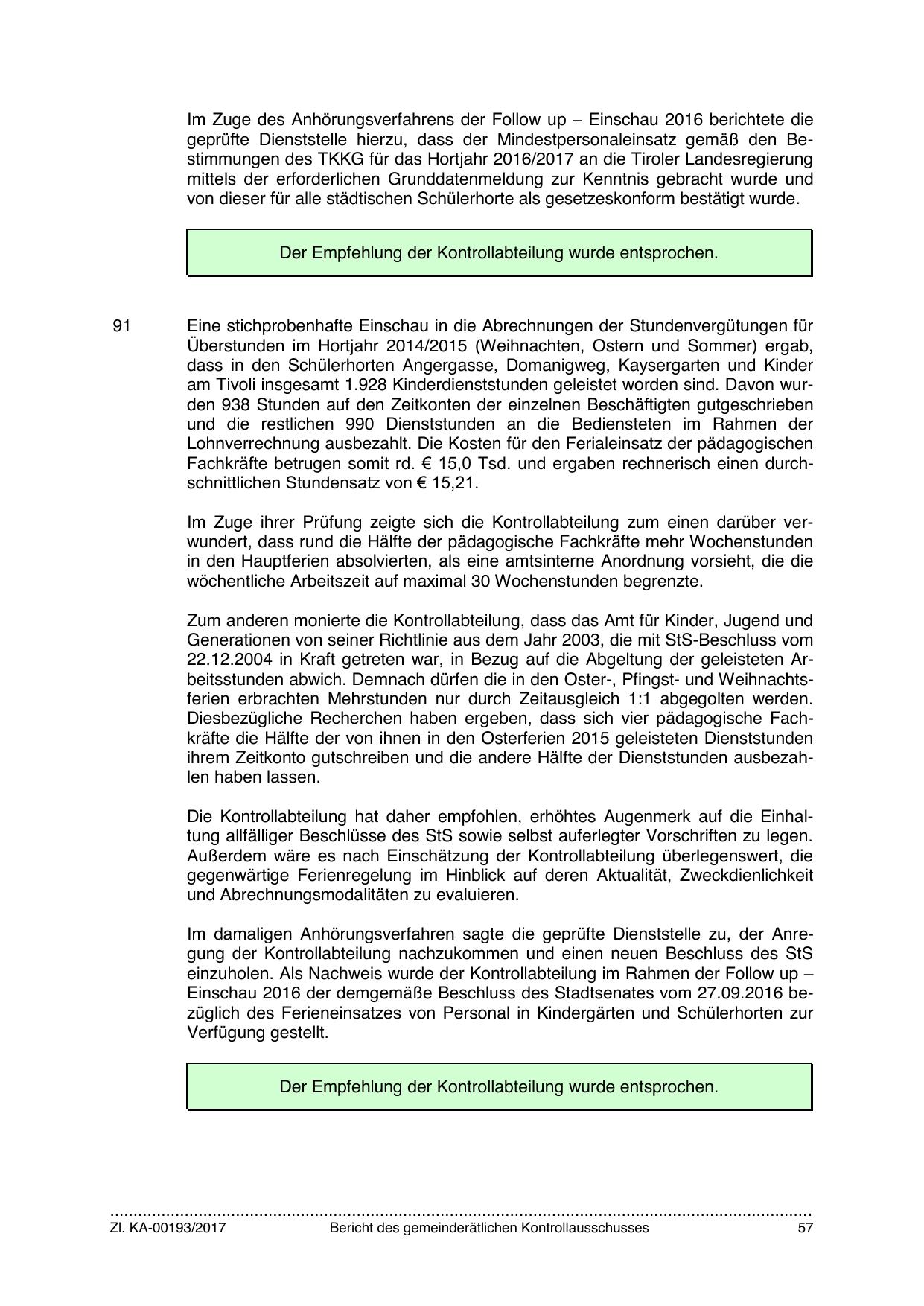 geprüfte Dienststelle hierzu, dass der Mindestpersonaleinsatz gemäß den Bestimmungen des TKKG für das Hortjahr 2016/2017 an die Tiroler Landesregierung