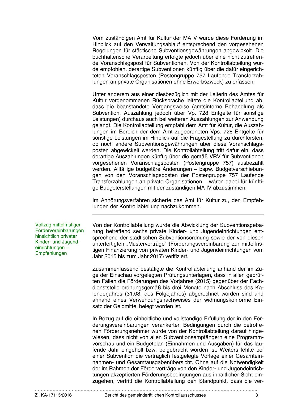 Von der Kontrollabteilung wurde die Abwicklung der Subventionsgebarung betreffend sechs private Kinder- und Jugendeinrichtungen entsprechend der städtischen Subventionsordnung sowie der von diesen